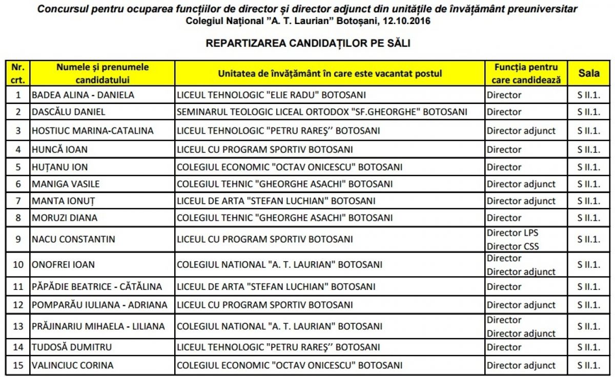 Interesant este faptul că în prima sală de examinare au fost repartizați unii dintre cei mai cunoscuți directori de la Botoșani precum Ioan Huncă, fostul soț din acte al Mihaelei Huncă, cuplul de conducere de la Colegiul Național AT Laurian Ioan Onofrei și Mihaela Prăjinariu, Ion Huțanu de la Colegiul Economic Octav Onicescu, Constantin Nacu, contracandidatul lui Huncă de la Liceul cu Program Sportiv, Diana Moruzi de la Colegiul Tehnic Gheorghe Asachi sau Beatrice Păpădie de la Liceul de Artă Ștefan Luchian.