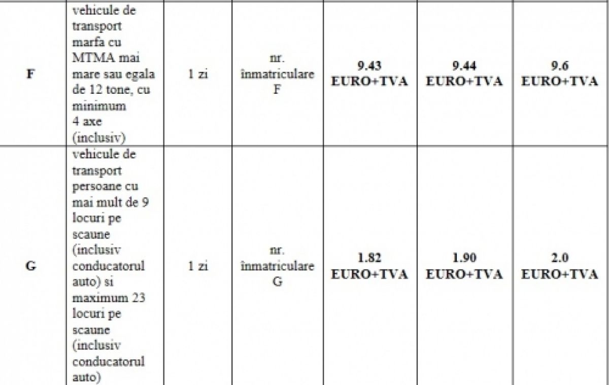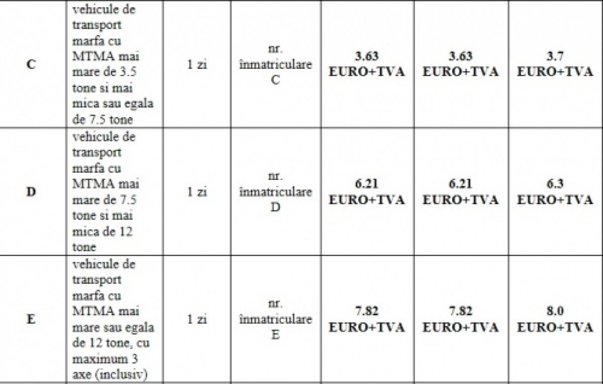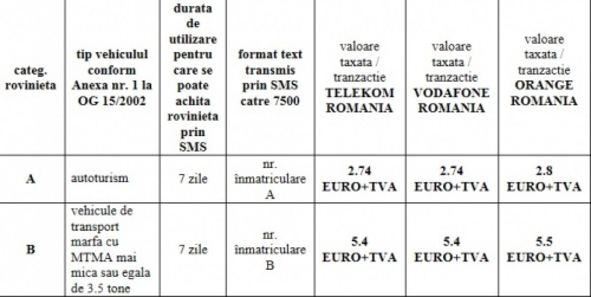 Tarifele aplicate de către operatorii de telefonie mobilă, odată cu realizarea posibilității de achitare a tarifului de utilizare pentru noile categorii de vehicule, pot fi văzute în tabelul de mai jos.(Sursa: România TV)