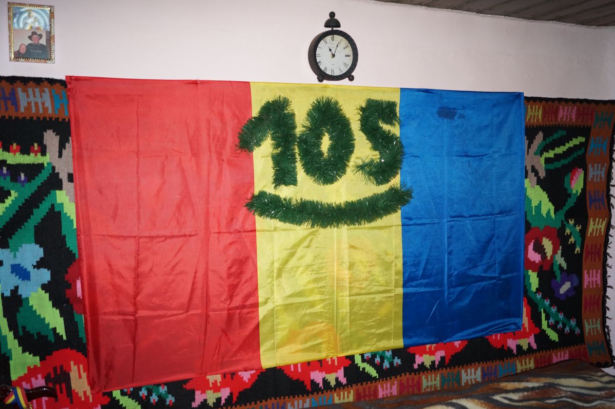 La loc de cinste pe perete, familia a expus tricolorul pe care a pus numărul ”105”, vârsta sărbătorită. Tot la loc de cinste se afla și mesajul de felicitare din partea Ministerului Apărării Naționale.