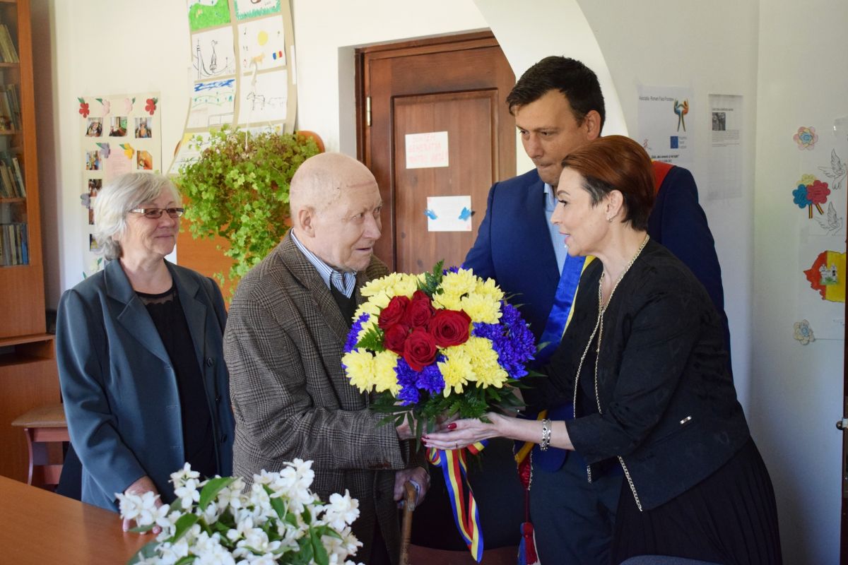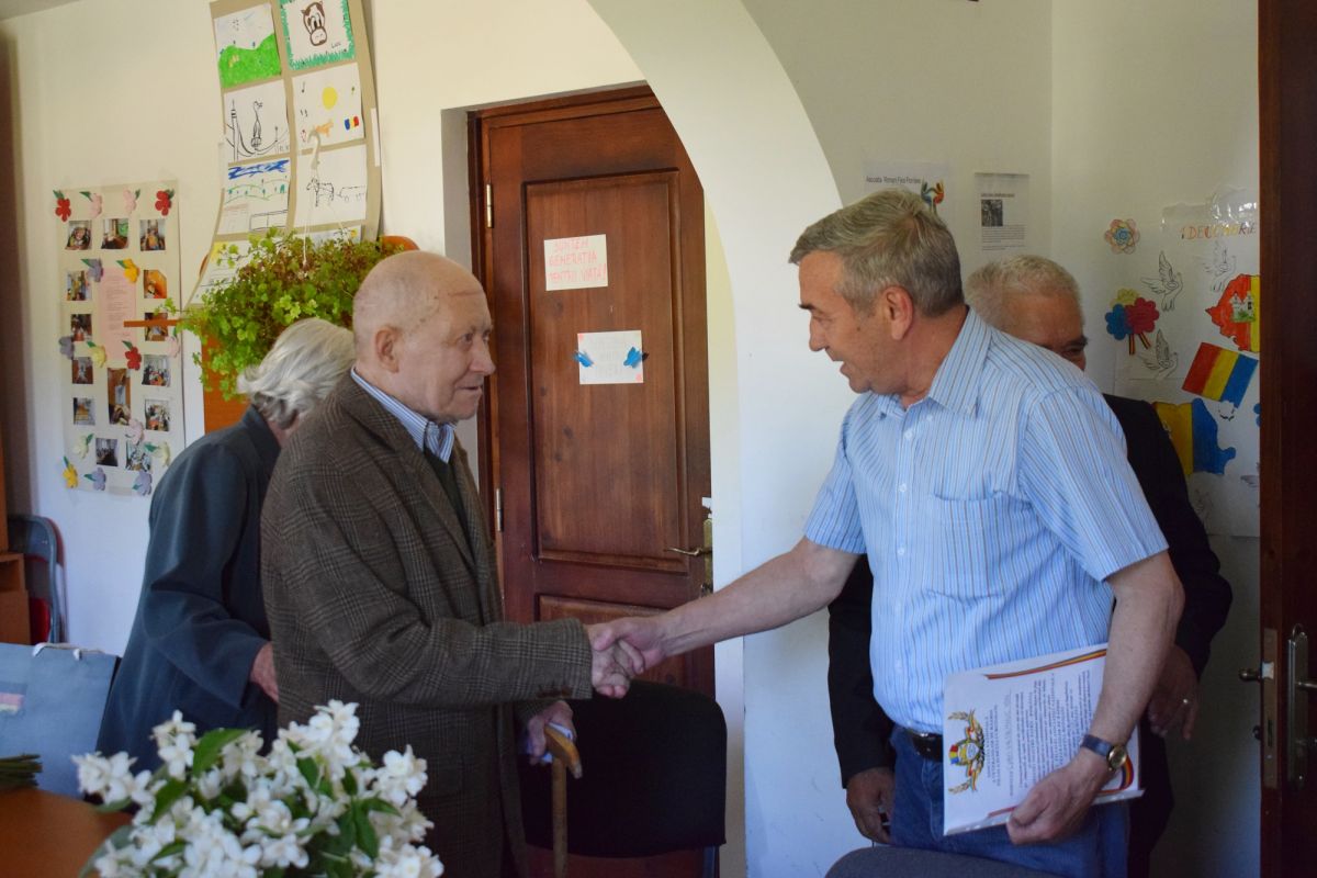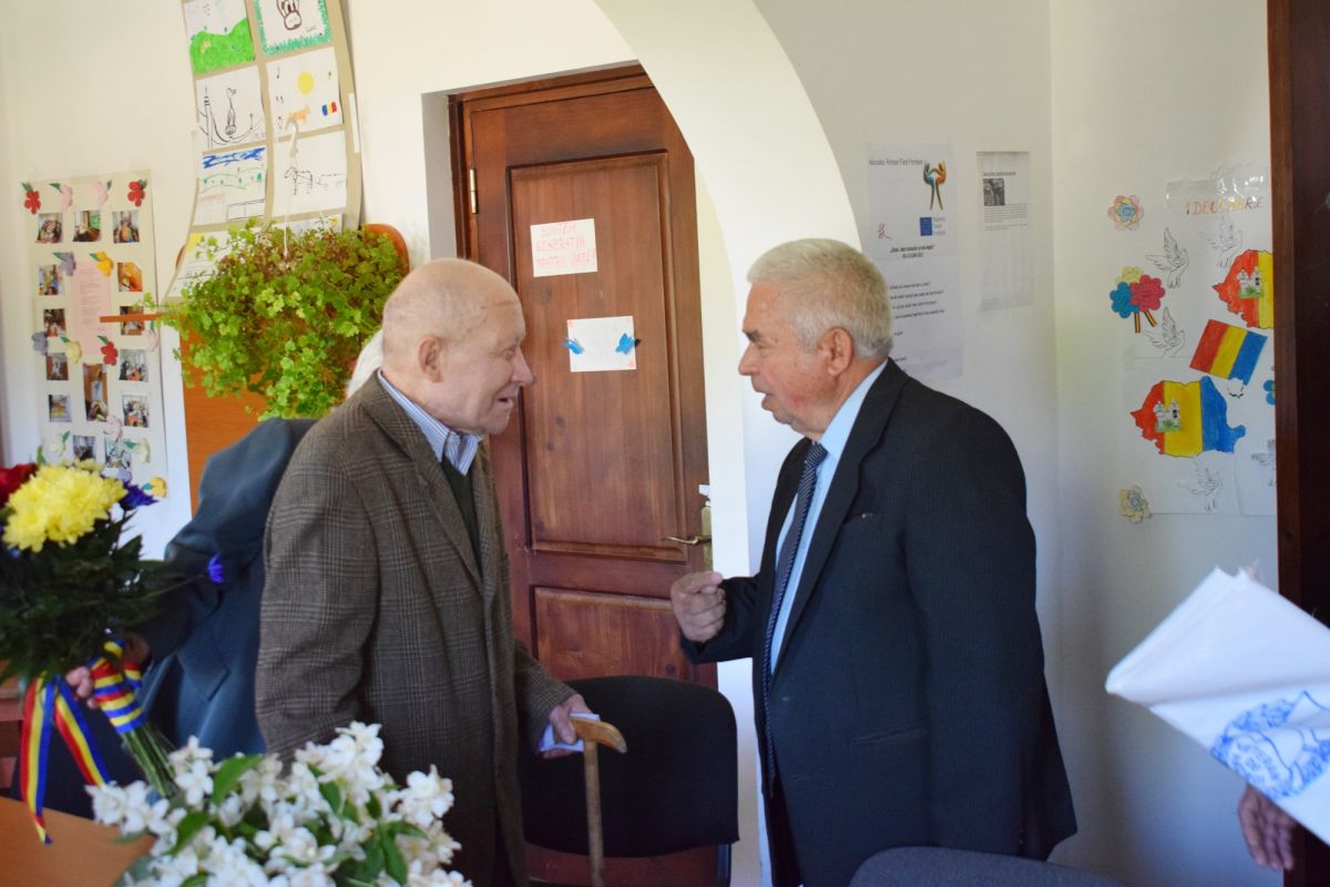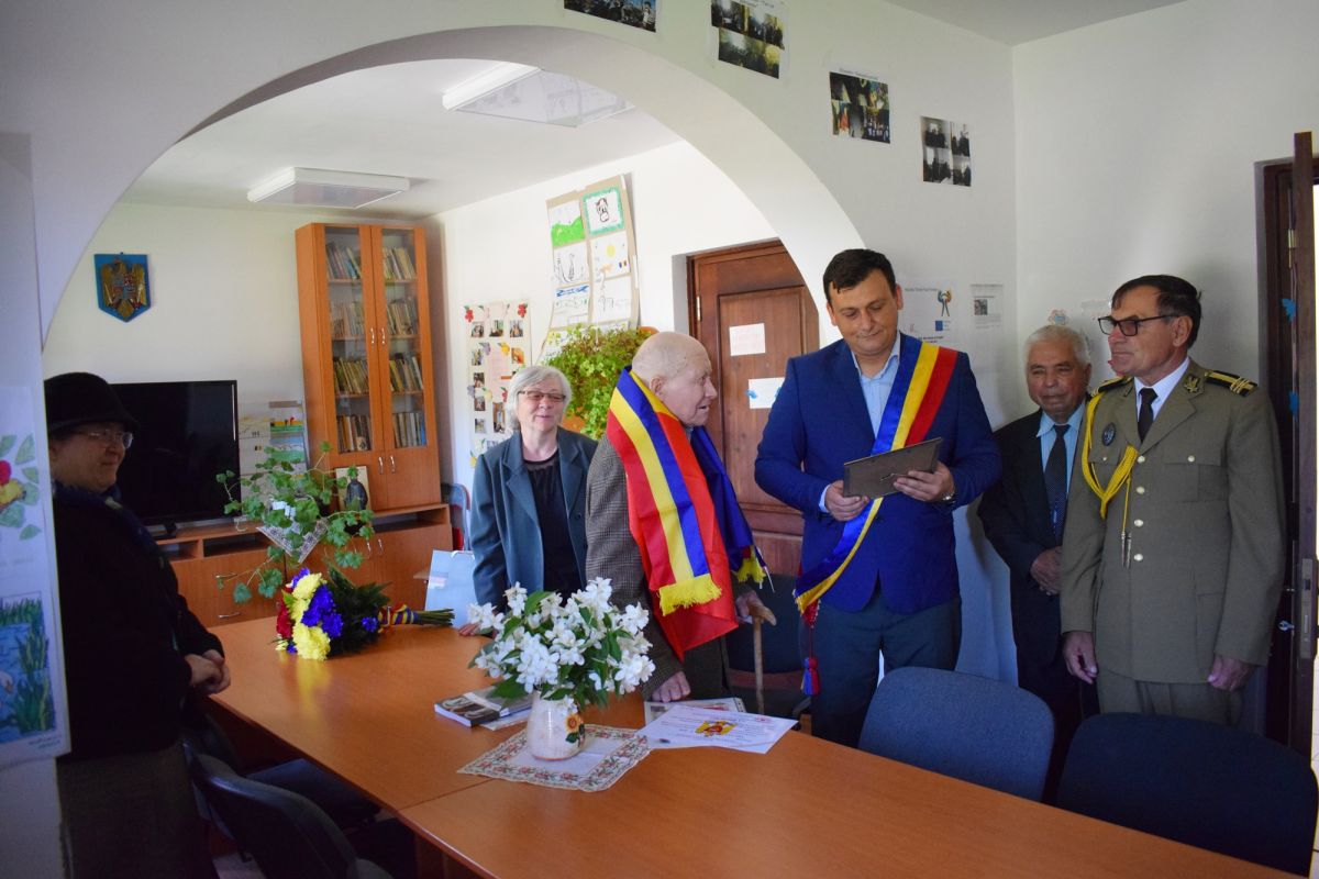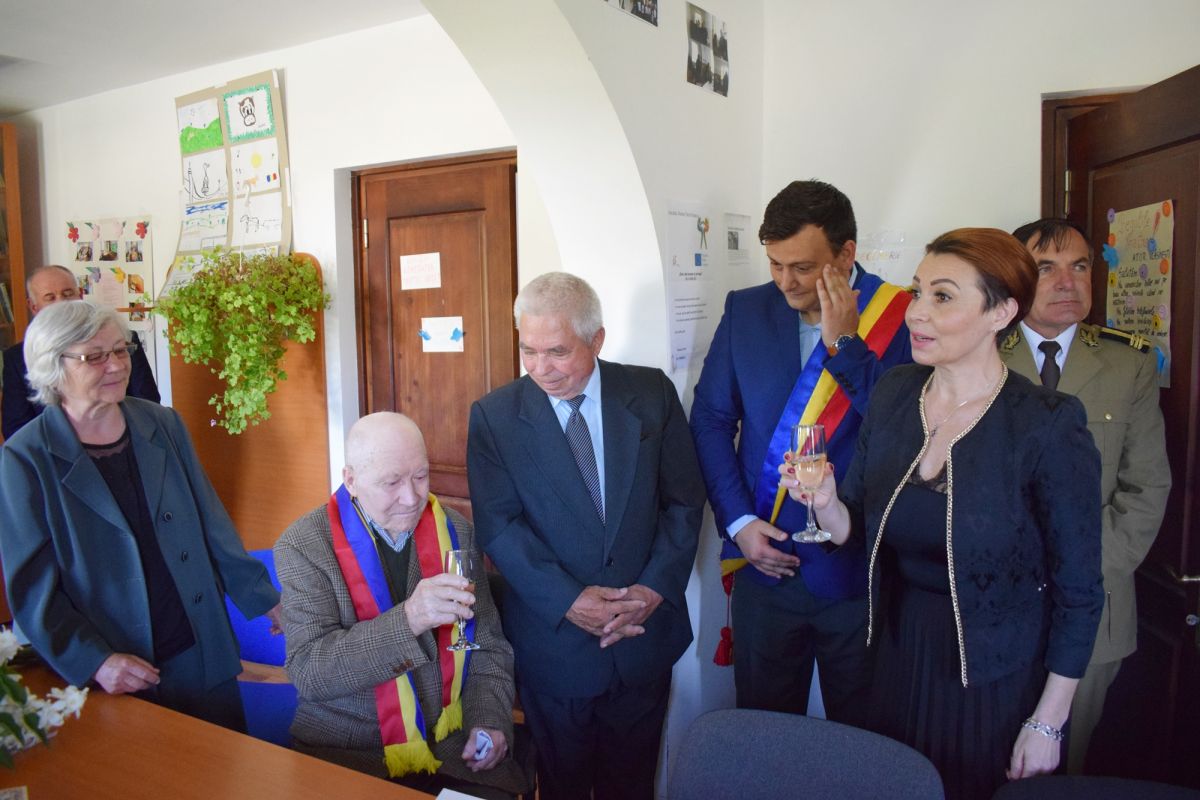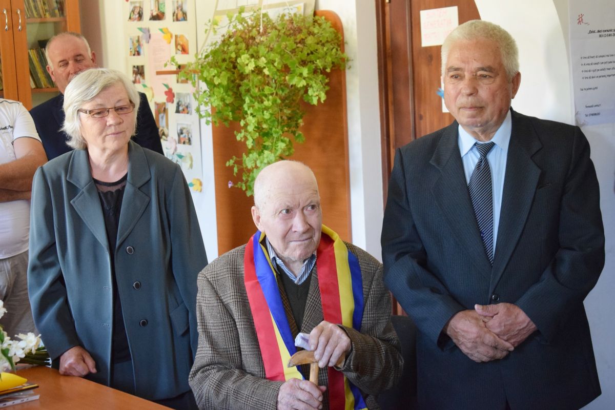 Primarul Andrei Boariu i-a oferit sărbătoritului o diplomă de recunoştinţă pentru întreaga sa viaţă, un tort şi împreună cu toţi invitaţii au ciocnit o cupă de şampanie.