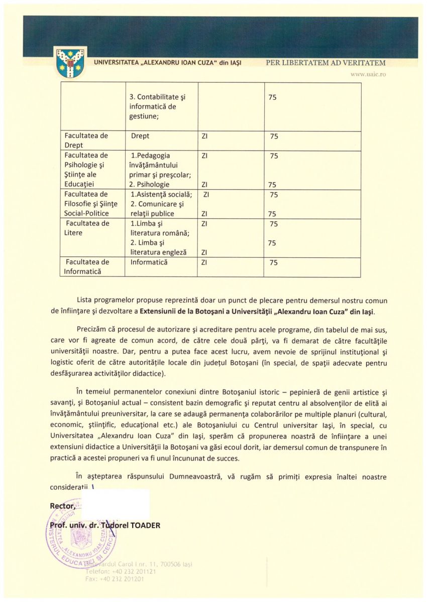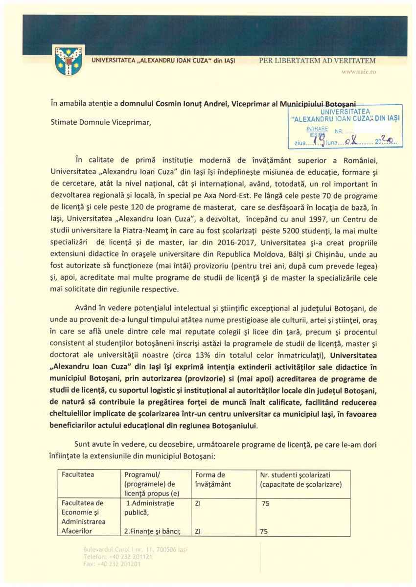 Pot să anunț cu bucurie că a mai fost realizat un pas pentru înființarea Extensiunii de la Botoșani, a Universității „Alexandru Ioan Cuza” din Iași.