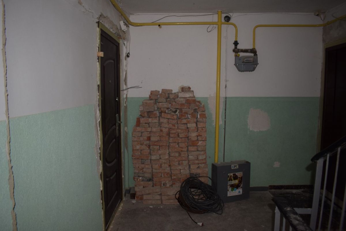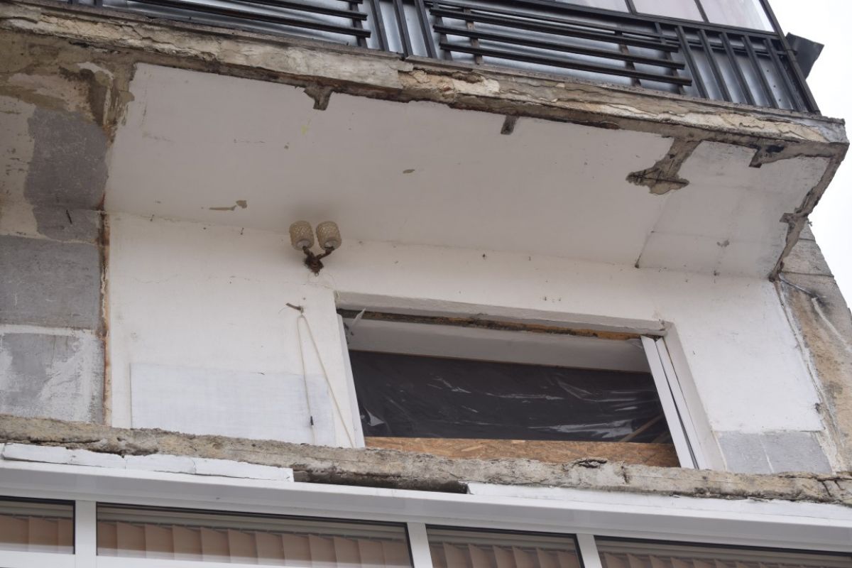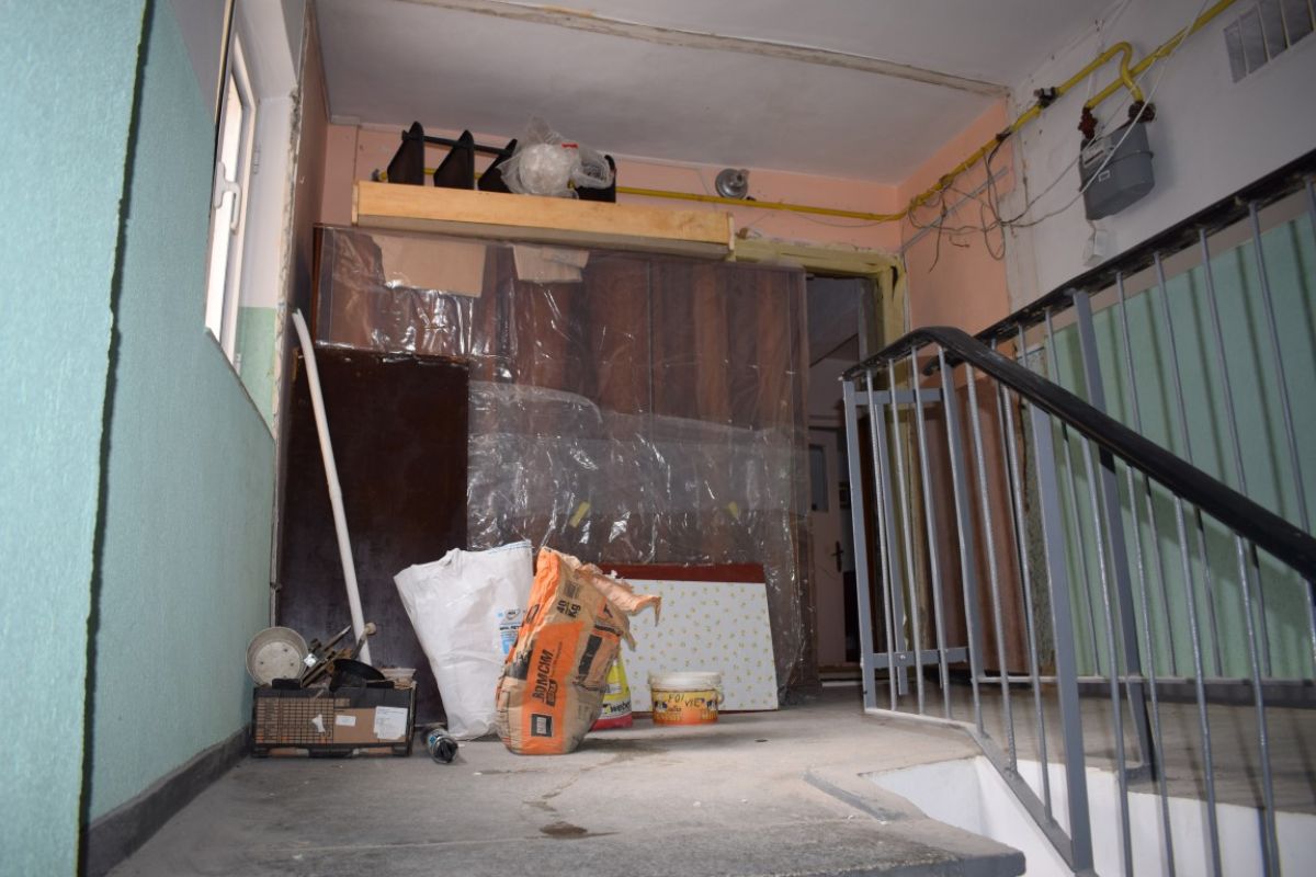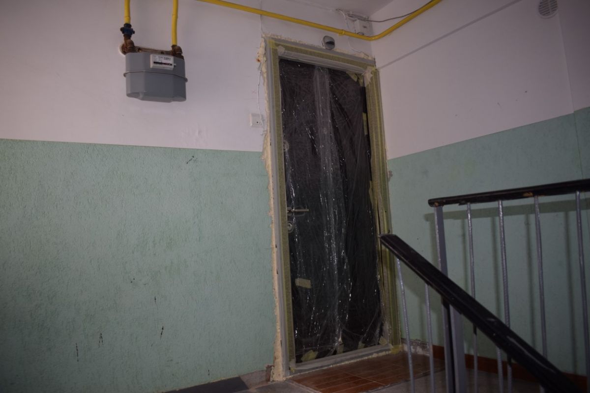 La etajul doi din blocul afectat, într-unul din apartamente ușa lipsește iar în interior se aud lovituri de ciocan, semn că se fac reparații.