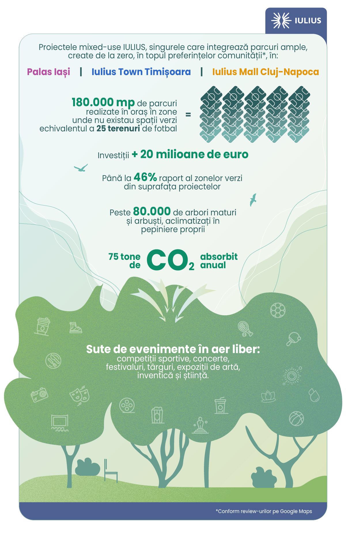 Încă de la primul proiect mixed-use, inaugurat la Iași în 2012 - Palas, compania IULIUS și-a concentrat resursele și pentru integrarea naturii în proiectele sale. Este vorba despre 18 hectare de spații verzi create de la zero sau reamenajate, în care s-au investit peste 20 de milioane de euro și care au devenit locurile preferate de petrecere a timpului liber ale comunităților din orașele Iași, Timișoara și Cluj-Napoca. Unicitatea lor este dată de faptul că sunt integrate în proiecte mixte, unde oamenii au acces la restaurante, cafenele sau diverse servicii, se pretează organizării diverselor evenimente, dar se diferențiază și prin modul de amenajare.