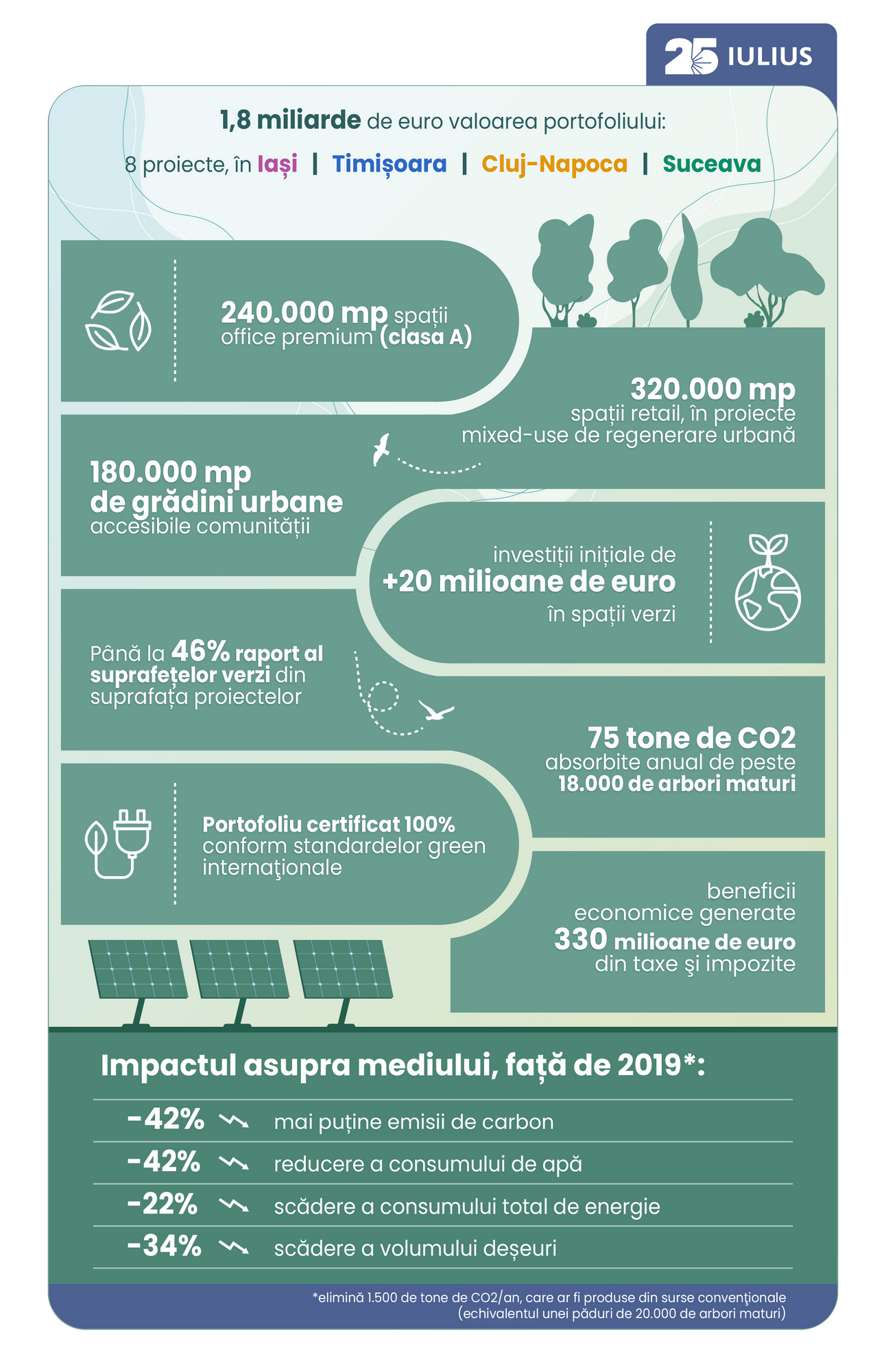 „În viziunea noastră, sustenabilitatea nu se măsoară doar în indicatori tehnici, ci mai ales în felul în care proiectele contribuie la bunăstarea pe termen lung a orașelor și a locuitorilor. Iar prin intermediul grădinilor urbane - Palas Iași, Iulius Gardens Timișoara și Iulius Parc din Cluj-Napoca - am reușit să creăm legături între natură și comunitate, între spațiul construit și cel «trăit», susținând un stil de viață echilibrat și conectat la verde”, a spus Dan Adrian Chelaru, Group Sustainability Officer IULIUS.