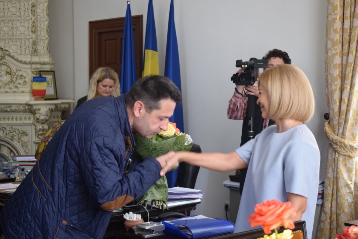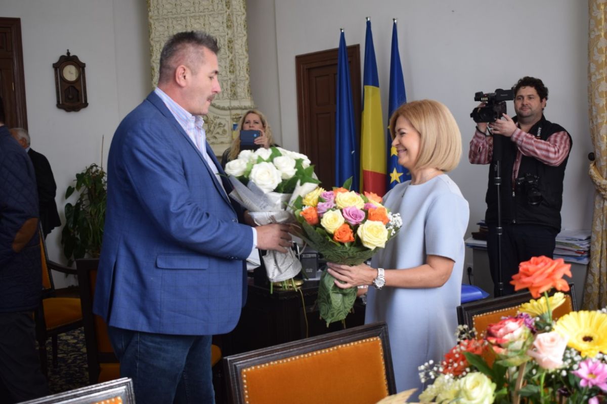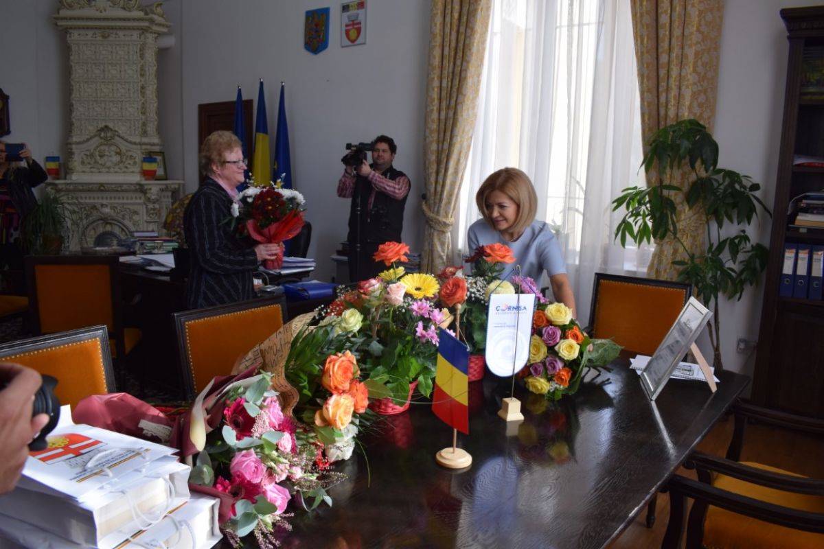 Astăzi după ceremonia prin care i-a fost conferit titlul de cetățean de onoare, medicul Doina Hrehoreț a susținut o scurtă conferință de presă în biroul primarului Cătălin Flutur, unde a primit flori din partea pacienților pe care i-a operat în trecut.