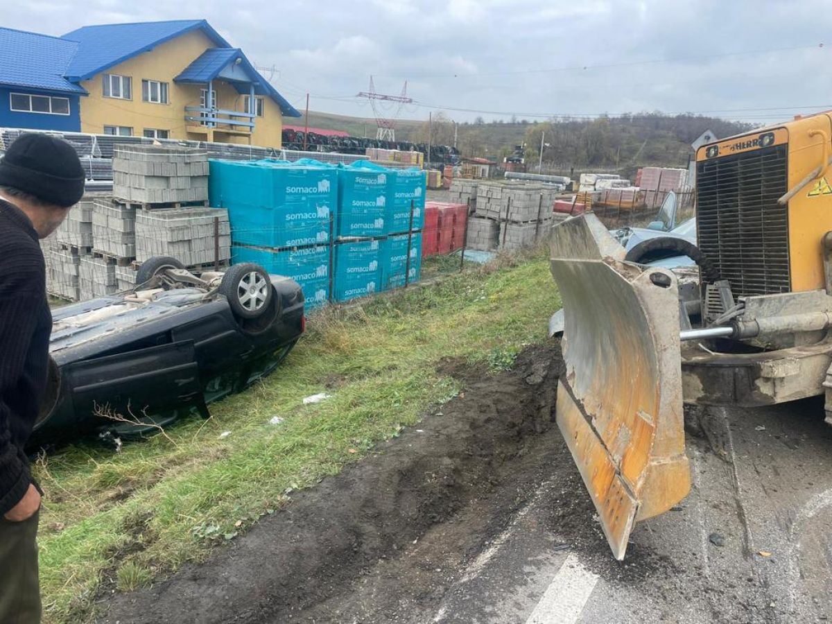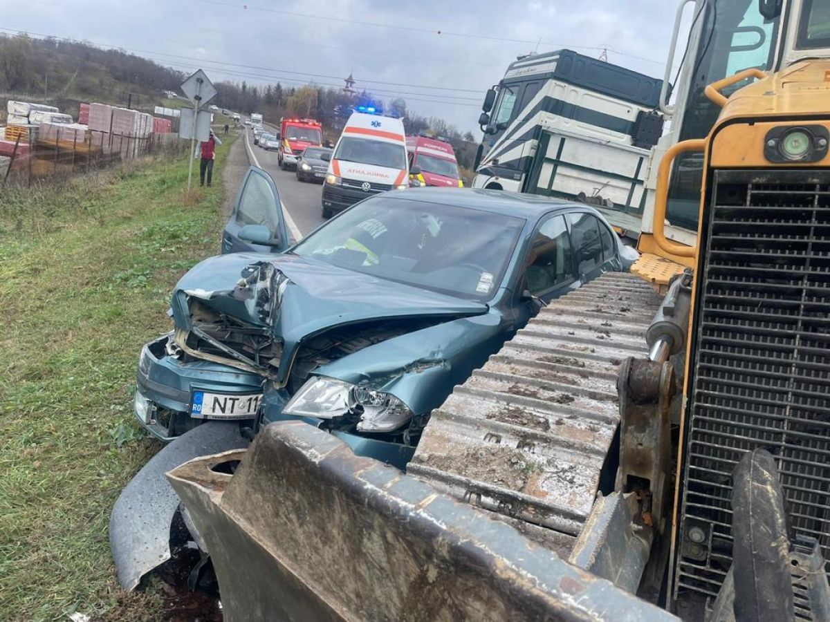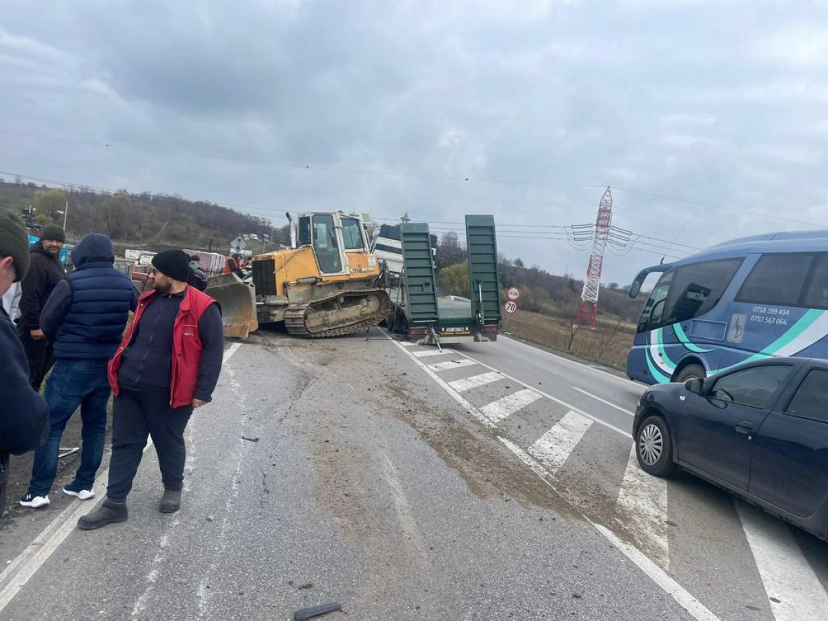 Trei persoane au ajuns la spital după ce un buldozer cu șenile a căzut peste două mașini, pe "drumul morții" E85.