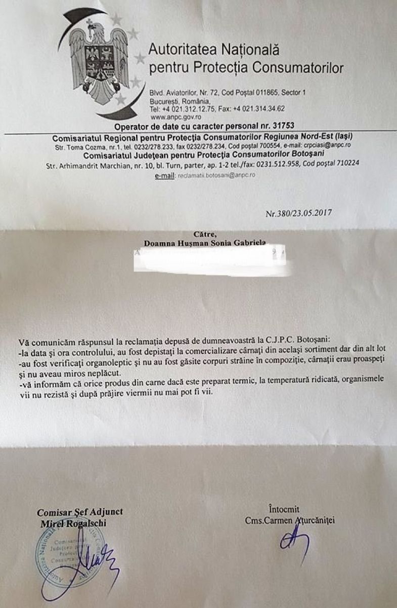 Cu alte cuvinte, cârnații n-ar fi fost suficient de prăjiți încât să moară toți viermii. Ba mai mult, în ciuda imaginilor mai mult decât elocvente, CJPC Botoșani i-a comunicat că la controlul efectuat nu a descoperit ”corpuri străine” în cârnați, iar aceștia ”erau proaspeți și nu aveau miros neplăcut”.