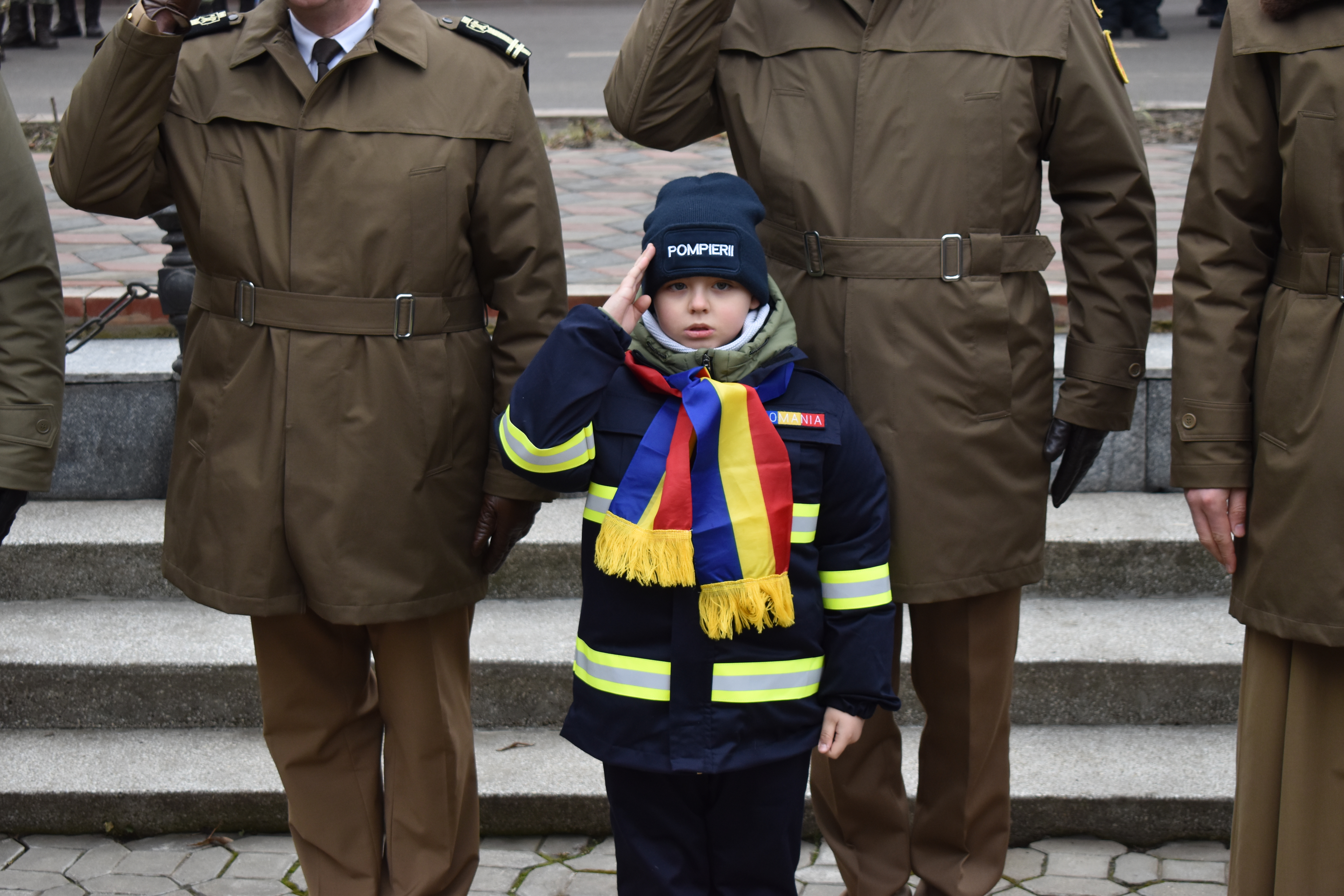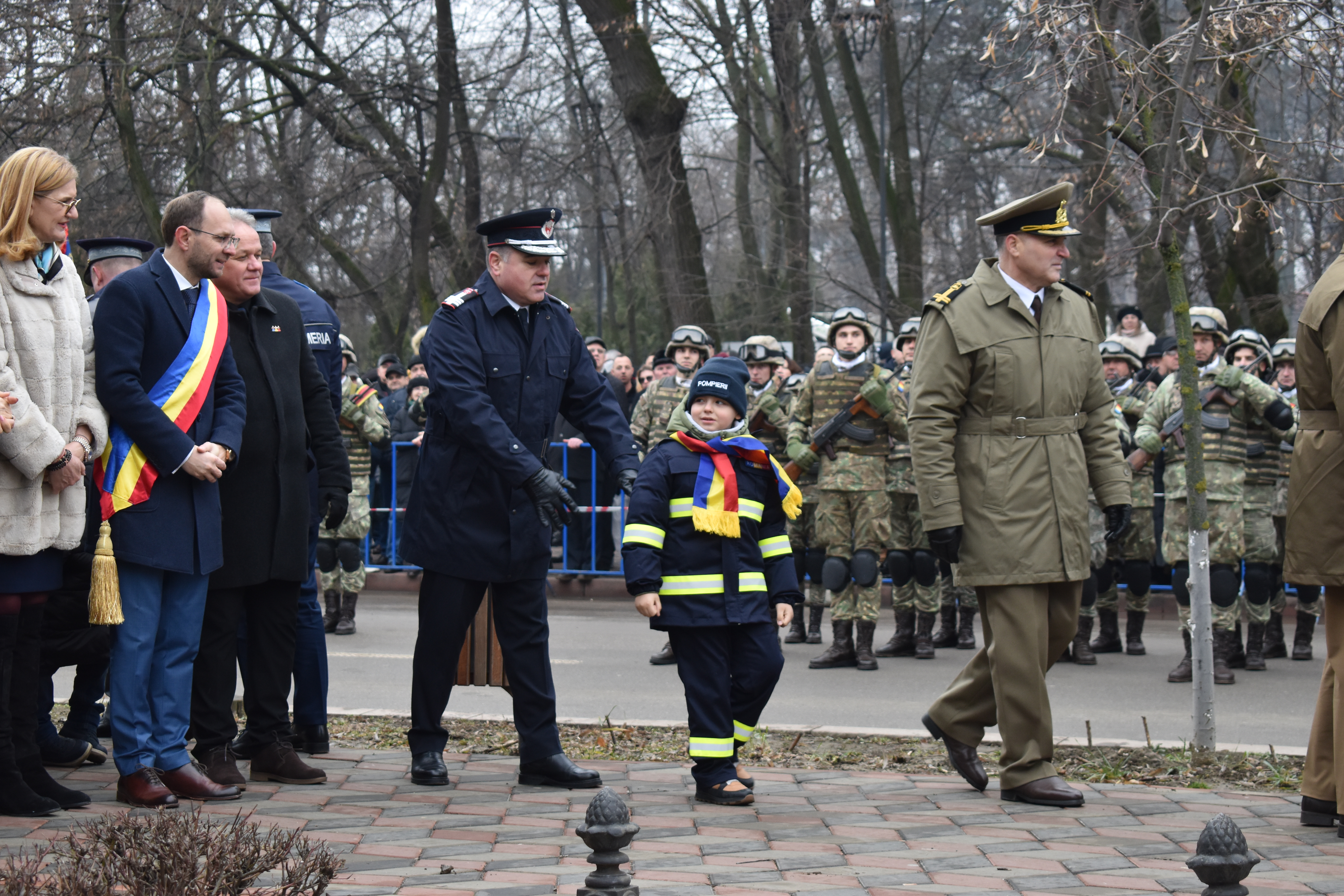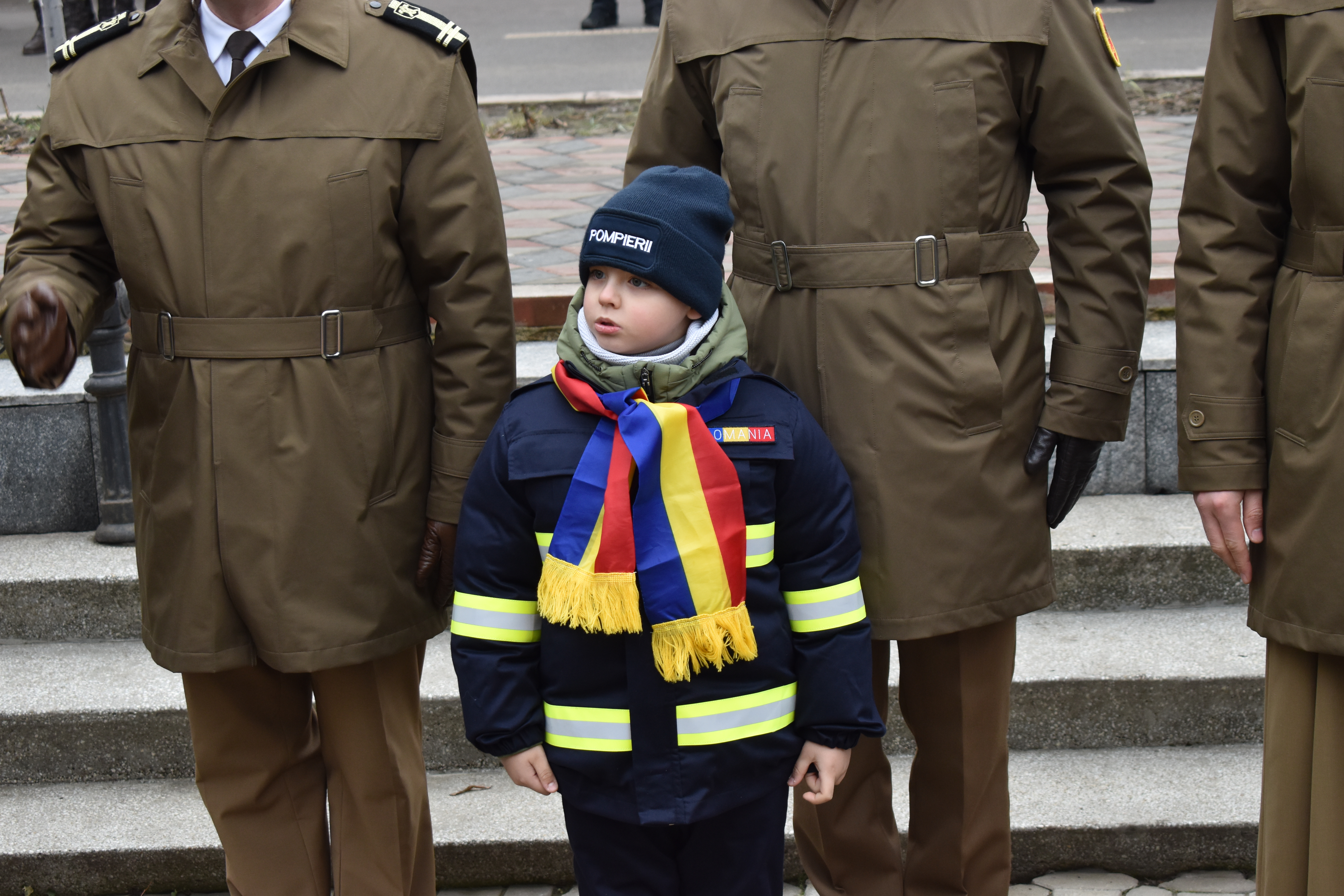 O altă prezență inedită a fost un băiețel îmbrăcat în uniforma de pompier, care a captat atenția celor prezenți. Copilul a afișat o atitudine solemnă asemenea militarilor de care s-a înconjurat la depunerea jerbelor de flori.