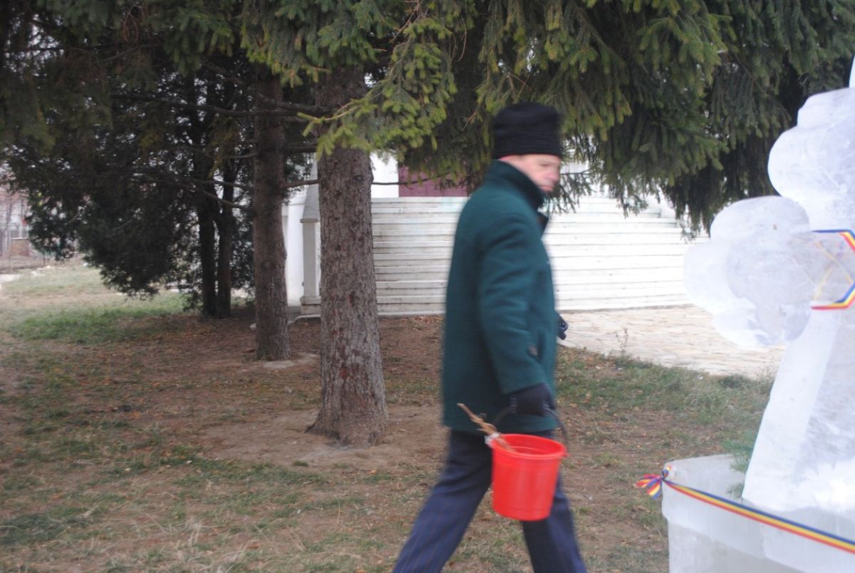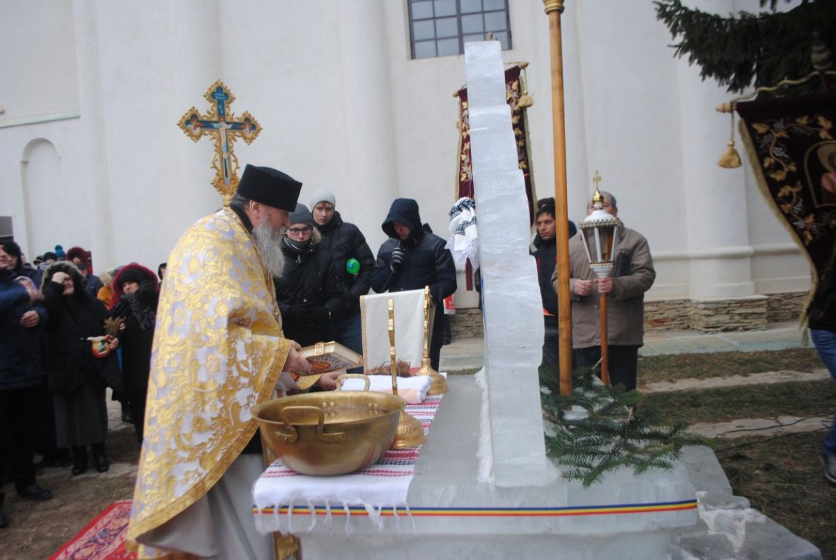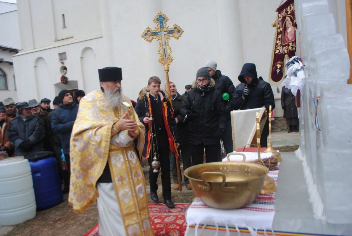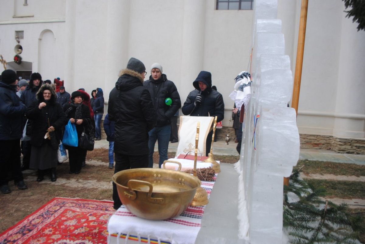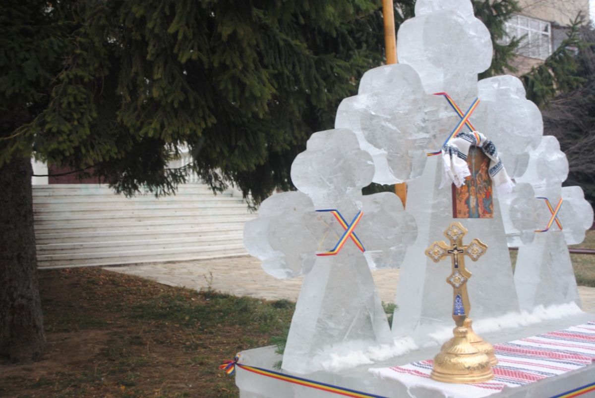 În curtea Bisericii Sfântul Ilie au fost aduse și trei cruci de gheață sculptate cu multă măiestrie și s-a sfințit o cantitate de două tone de apă.
