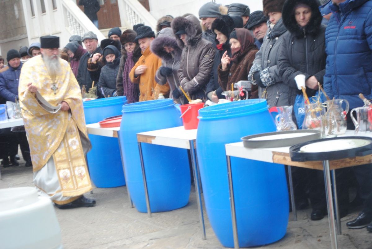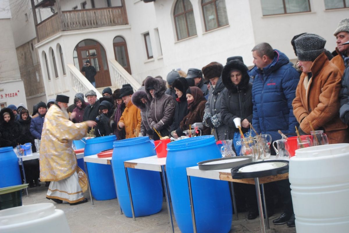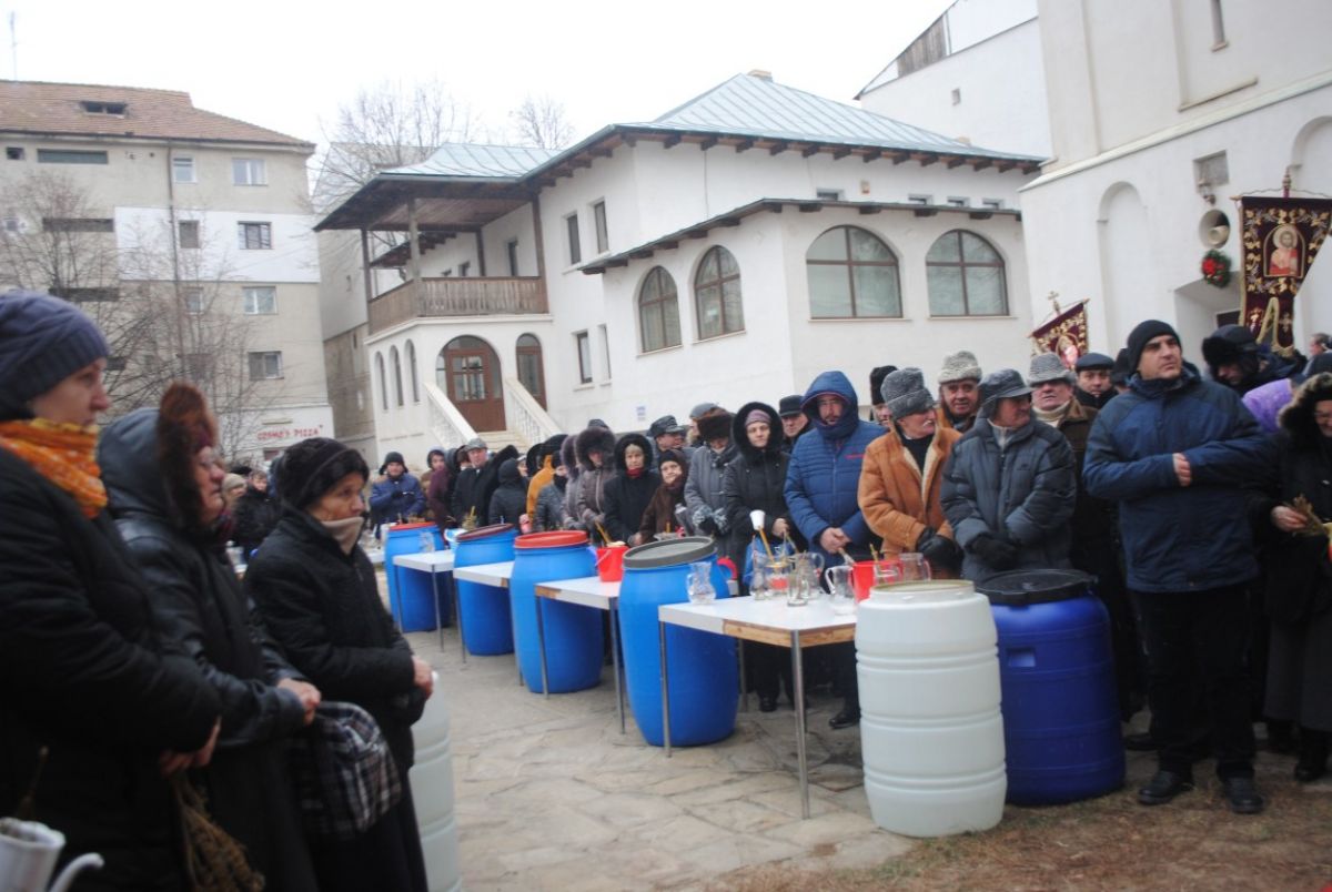 Pentru sfințire, reprezentanții bisericii au pregătit 13 butoaie de plastic pentru ca agheasma să fie împărțită enoriașilor participanți la cultul religios.