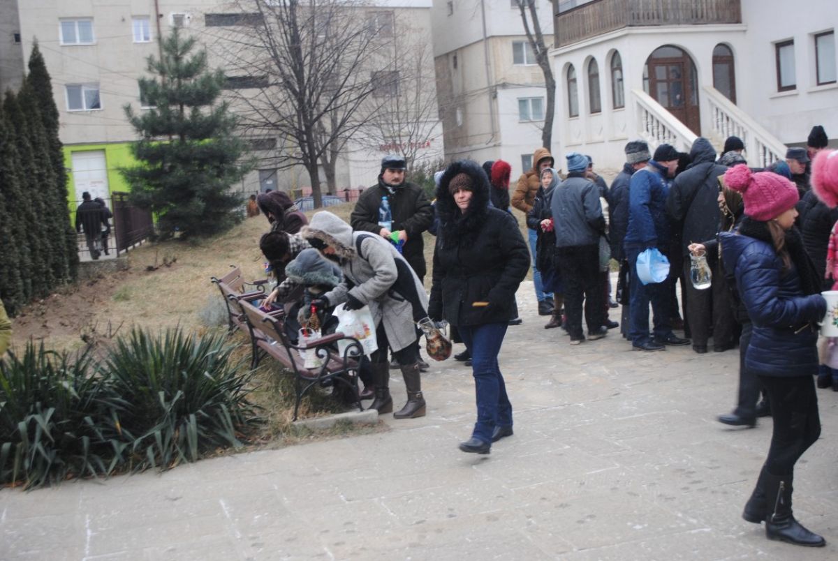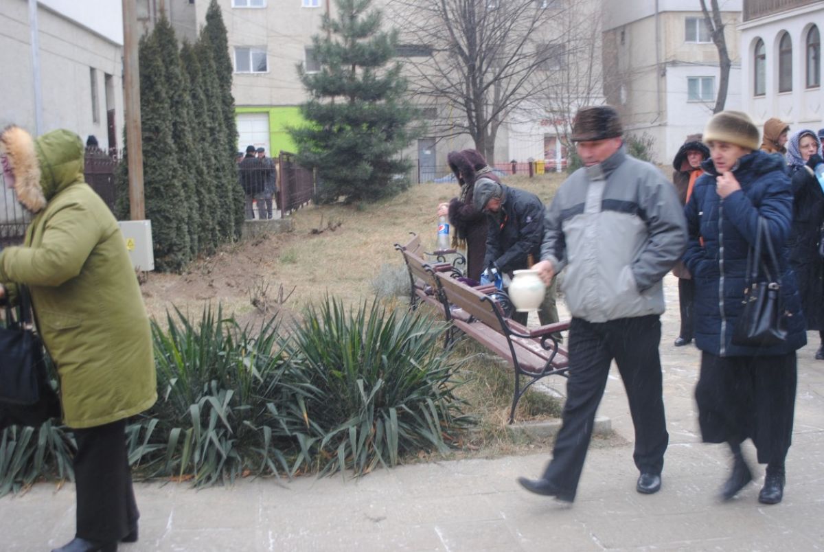 Credincioșii pregătiți cu căni de sticlă cu fire de busuioc, pet-uri și găleți, au stat la rând pentru a le umple.