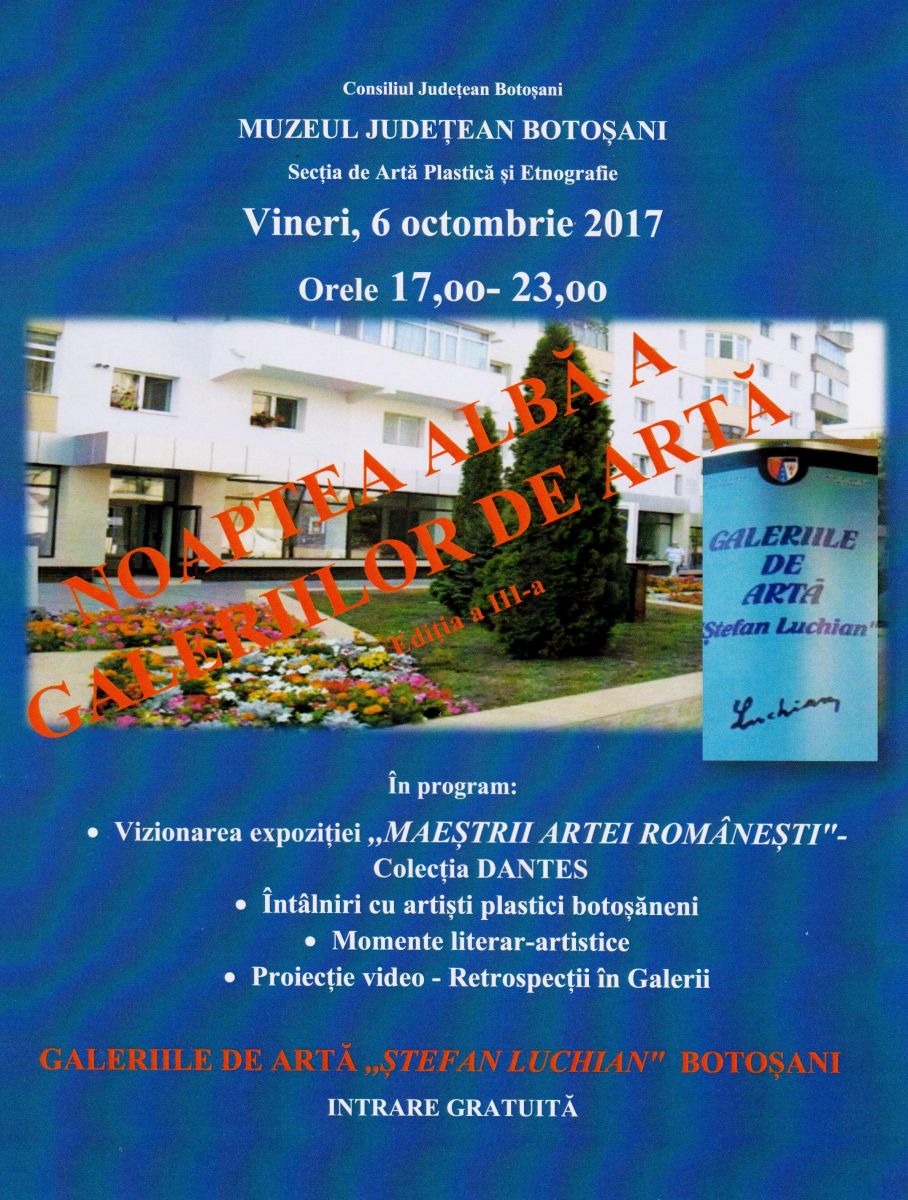 Muzeul Judeţean Botoşani – Secția de Artă Plastică și Etnografie, organizează vineri, 6 octombrie 2017, în spaţiul Galeriilor de Artă ,,Ştefan Luchian”, evenimentul cultural ,,Noaptea albă a Galeriilor” - ediţia a III-a, între orele 17:oo – 23:oo.
