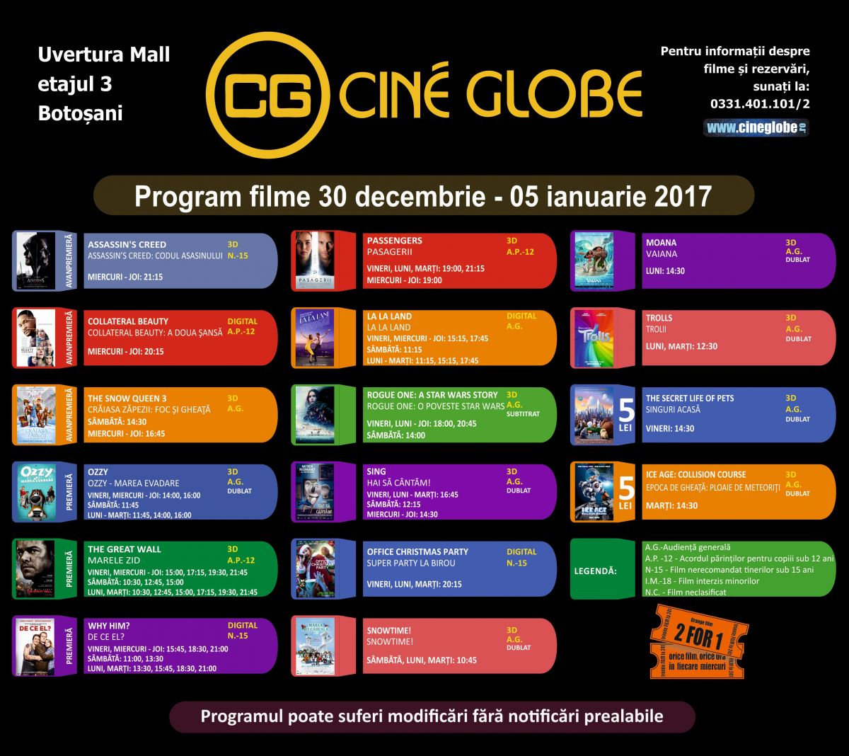 Iubitorii de film din Botoşani pot petrece momente plăcute în perioada 30 decembrie – 5 ianuarie la Cine Globe din incinta Uvertura Mall cu noi pelicule care vor fi proiectate în avanpremieră.