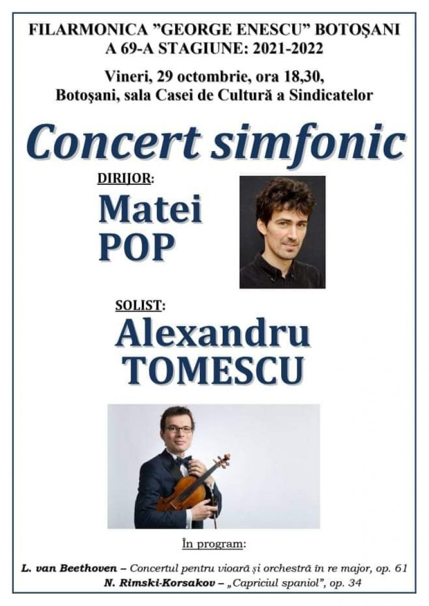 Alături de instrumentiștii botoșăneni, Alexandru Tomescu va interpreta Concertul pentru vioară și orchestră în re major, op. 61, de L. van Beethoven, programul fiind completat de Capriciul spaniol, op. 34, de N. Rimski-Korsakov.
