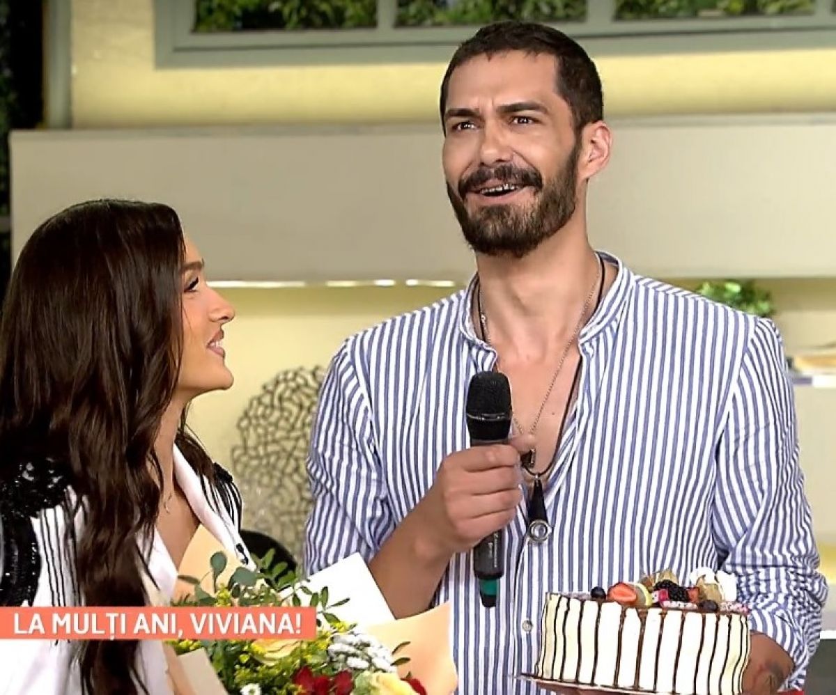 Pe lângă florile și urările de la colegi, frumoasa brunetă a avut parte de o surpriză de proporții din partea echipei. În platou și-au făcut apariția iubitul Vivianei, actorul George Burcea, și sora tinerei, Bianca Sposub.