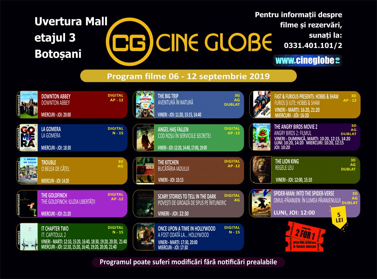 ”Downton Abbey”, ”Aventură în natură”, ”Cod Roșu în Serviciile Secrete”, ”O belea de cățel”, ”Bucătăria Iadului”, ”Regele Leu” sunt câteva dintre filmele care pot fi vizionate începând de vineri, 6 septembrie, la Cine Globe Botoșani.