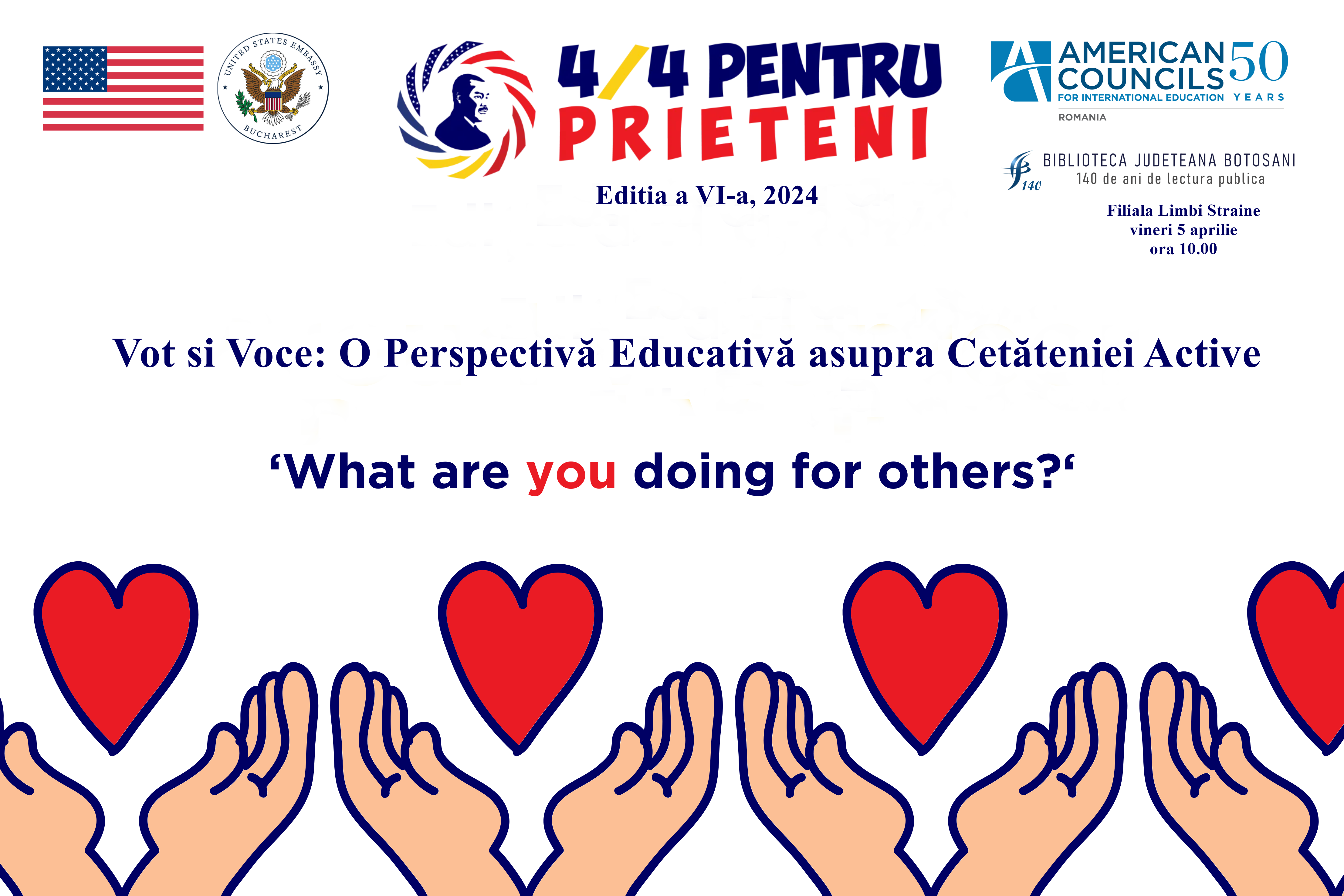 Ambasada Statelor Unite în România împreună cu American Councils for International Education au lansat proiectul „4/4PentruPrieteni” inspirat de gândurile remarcabilului activist american Dr. Martin Luther King, Jr.: „Întrebarea cea mai stringentă și importantă a vieții este: ce faci pentru ceilalți?”.