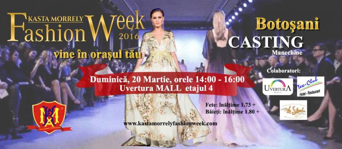 Începând cu orele 14:00 Turneul Kasta Morrely Fashion Week ajunge și în orașul Botoșani și oferă o oportunitate tuturor tinerilor ce își doresc o carieră în lumea modei și o șansă de a defila pentru cei mai în vogă designeri ai momentului. Tot ceea ce trebuie să facă este să vină, duminică, 20 martie, la etajul 4 în Uvertura Mall pentru a participa la casting. Mai multe detalii și înscrieri online pe https://kastamorrelyfashionweek.com/manechine/inscrieri/ . Uvertura Mall – Ne vedem în Centru!