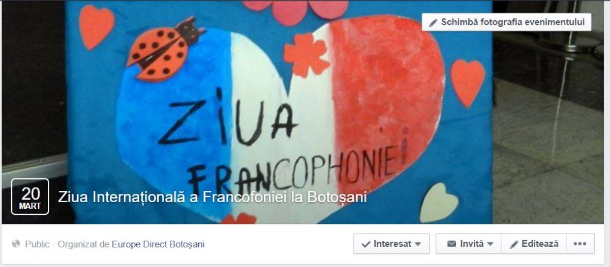 Duminică, 20 martie, este ziua în care Centrul Europe Direct Botoșani în colaborare cu Școala Europeană “Grigore Antipa” și Școala Gimnazială Nr. 12 va marca Ziua Internațională a Francofoniei prin muzică și poezii, între orele 11:00 – 12:30, la etajul 4, în Uvertura Mall. Sunt invitați să participe, ca spectatori sau ca interpreți și alți elevi din școlile botoșănene, profesori, părinți, iubitori ai limbii franceze. La final vor fi distribuite premii și publicații în temă. Pentru mai multe informații accesați https://fr-mg42.mail.yahoo.com/neo/launch?.rand=2cm8k5rdkggji#718813374.