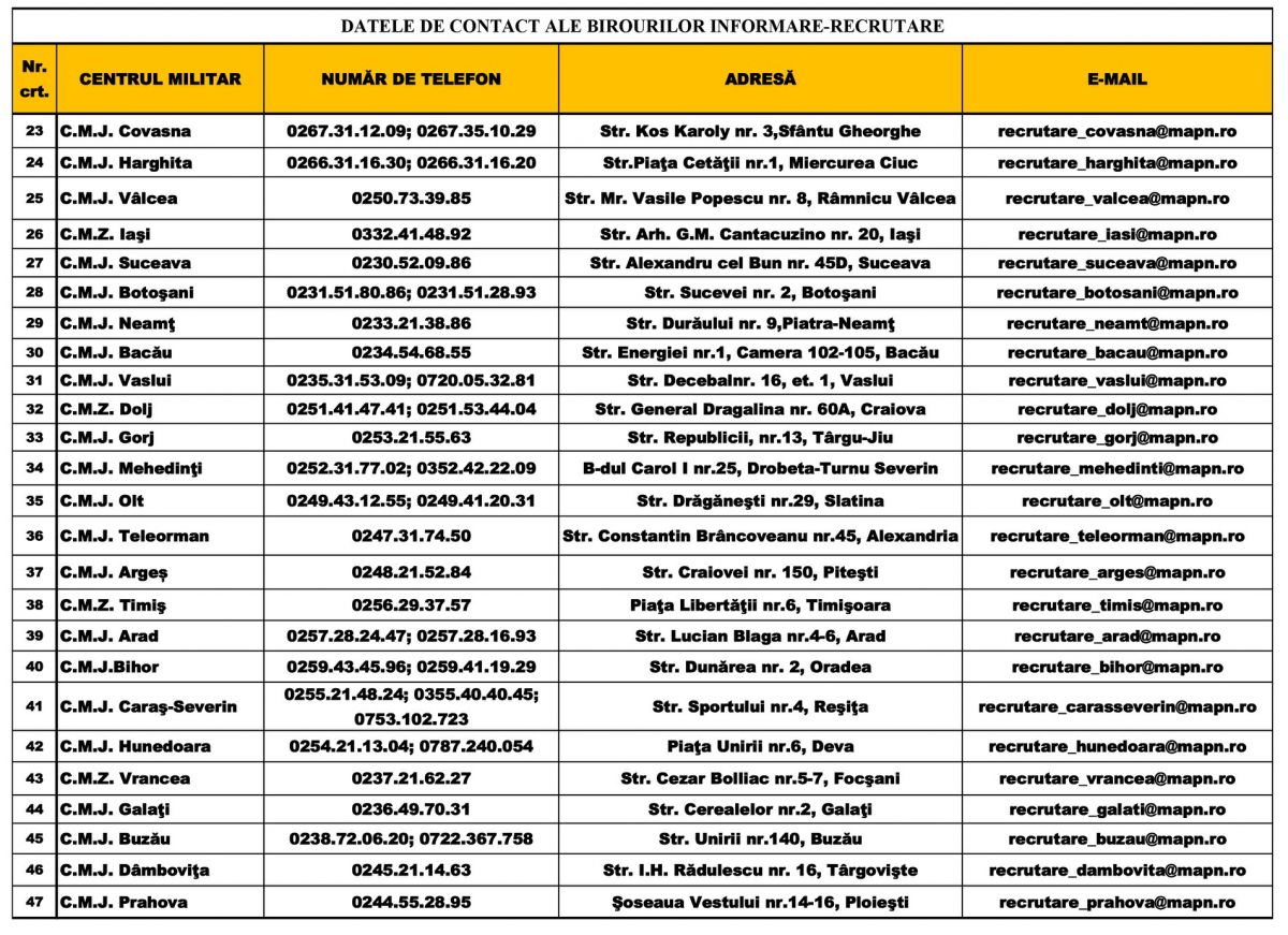 Este recomandat să suni înainte de a merge la biroul de recrutare pentru a afla cum te poți înscrie online (prin e_mail). Numerele de telefon și adresele birourilor informare-recrutare din cadrul centrelor militare le găsiți în foto jos.