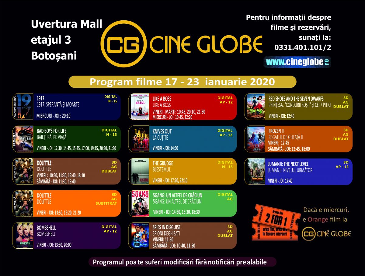 Cine Globe Botoșani vine cu oferta săptămânii 17 – 23 ianuarie 2020.