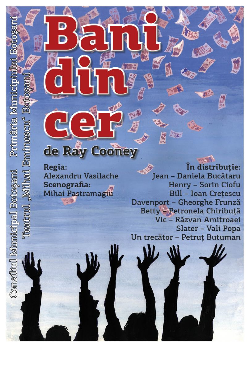 - Ray Cooney, autorul textului este, în primul rând, actor. El ştie ce înseamnă pentru un actor o situaţie foarte incitantă, explozivă. El ştie ce înseamnă replica. A scris un şir de piese ştiind toate cele spuse şi "Bani din cer" nu face excepţie de la "regulă". Este o piesă scrisă pentru actori. Textul aduce la rampă, în primul rând, actorii. Situaţiile se schimbă din trei în trei minute, dacă nu şi mai repede. Şi actorul şi personajul sunt puşi în situaţii limită. Este vorba de limita comediei, să ne înţelegem, nu de limita umanului! Iar echipa de actori de la Botoşani a probat reacţii deosebite, evident, în situaţii cu totul şi cu totul deosebite!