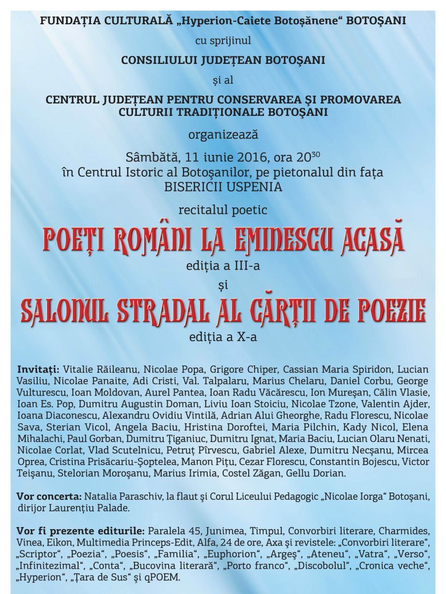 Consiliul Județean, Centrul Județean pentru Conservarea și Promovarea Culturii Tradiționale Botoșani organizează în perioada 10-12 iunie 2016, Concursul Național de Poezie și Interpretare Critică a Operei Eminesciene ”Porni Luceafărul…”ediția XXV-a Botoșani-Ipotești-Vorona. Iată mai jos programul: