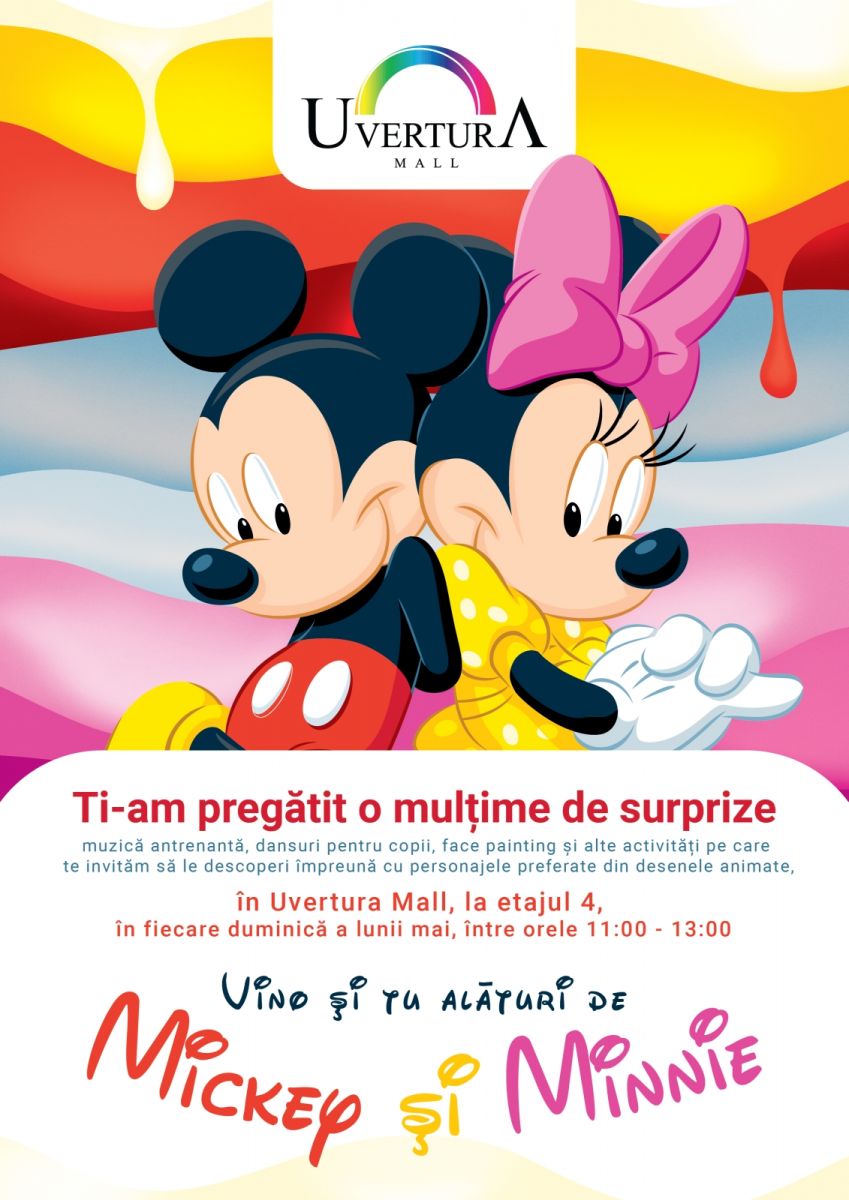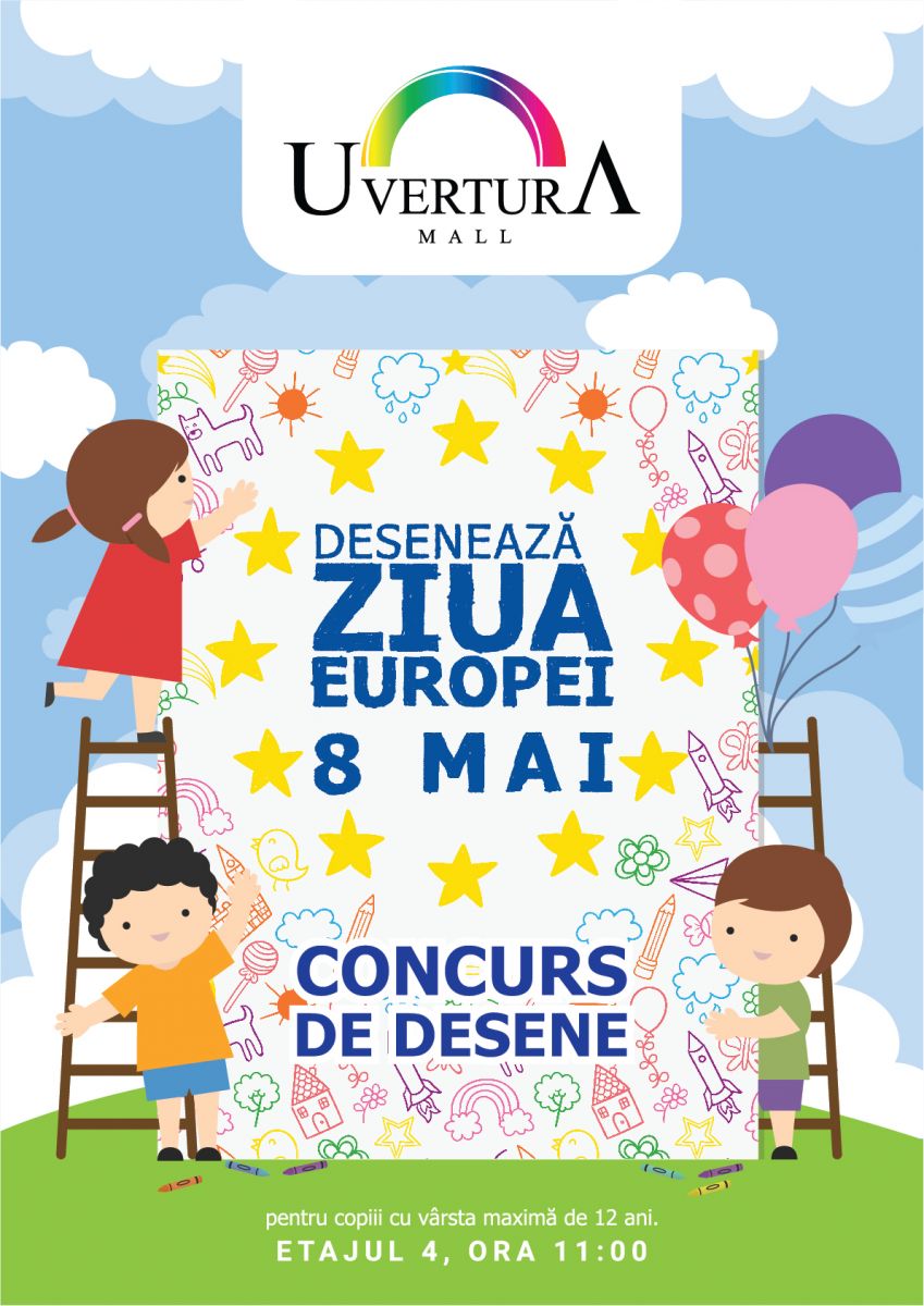Sâmbătă, cei mici sunt așteptați la atelierul de creație de la ora 14:00, etajul 3, unde sub îndrumarea moderatorilor de la Club Modas vor învăța să realizeze portrete în creion. De la ora 16:00 începe atelierul de dans, iar copiii sunt așteptați să exerseze și să învețe pași de dans. Mickey și Minnie vor fi din nou prezenți la etajul 4, duminică, 8 mai, între orele 11:00-13:00. Și de această dată, personajele preferate ale copiilor pregătesc o mulțime de surprize: muzica antrenantă, dansuri pentru copii, face painting și alte activități pe care copiii le vor descoperi împreună cu mascotele. Mai mult decât atât, duminica aceasta, Mickey și Minnie invită toți copiii la Concursul de desene a cărui tematică este ”Ziua Europei”. Competiția este deschisă contribuțiilor individuale ale copiilor cu vârsta de maxim 12 ani, care sunt predate către Mickey și Minnie, tot duminică, între orele 11:00-13:00. Desenele vor fi postate pe pagina de Facebook Uvertura, iar cele care strâng cel mai mare număr de like-uri până pe data de 9 mai, ora 12:00 vor fi premiate cu : locul 1- 150 lei, locul 2-100 lei, locul 3-50 lei. Sunt acceptate doar desene în format A4 realizate prin orice tehnică compoziţională: ulei, acuarelă, creion, peniţă, colaj, ceracolor etc.