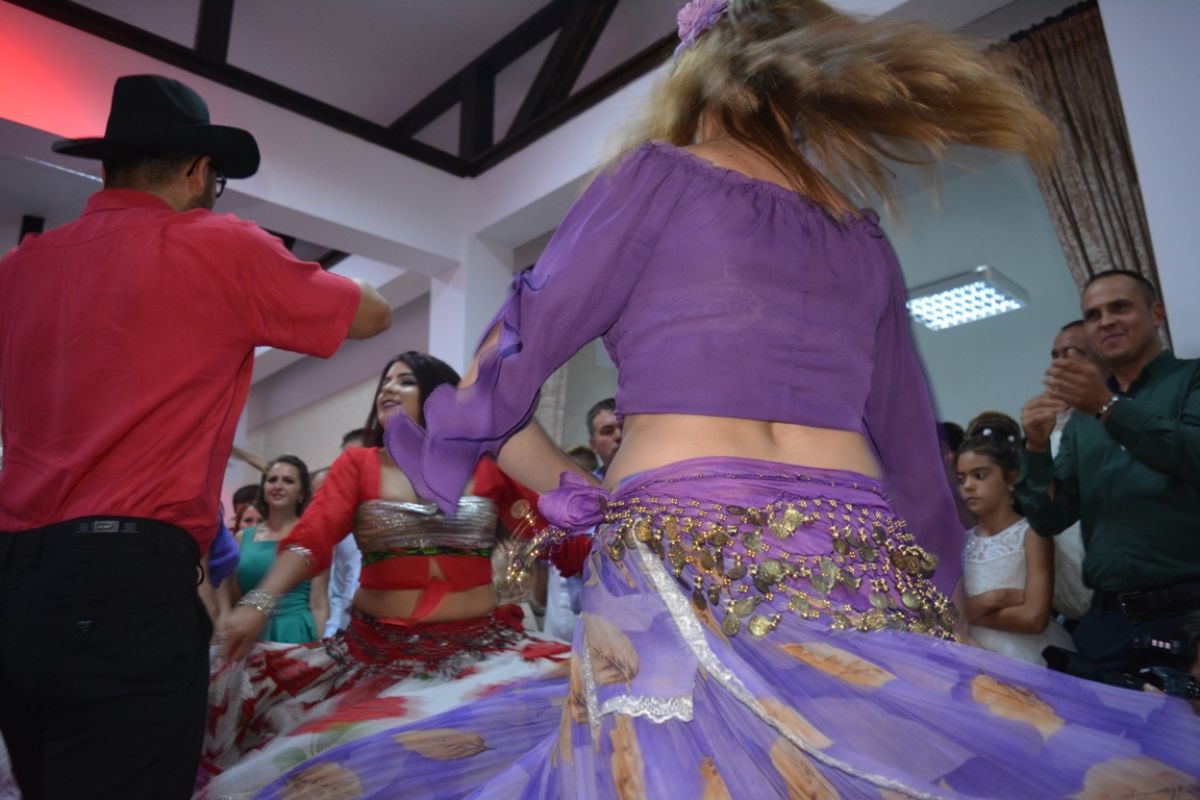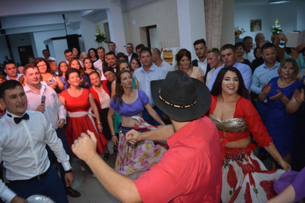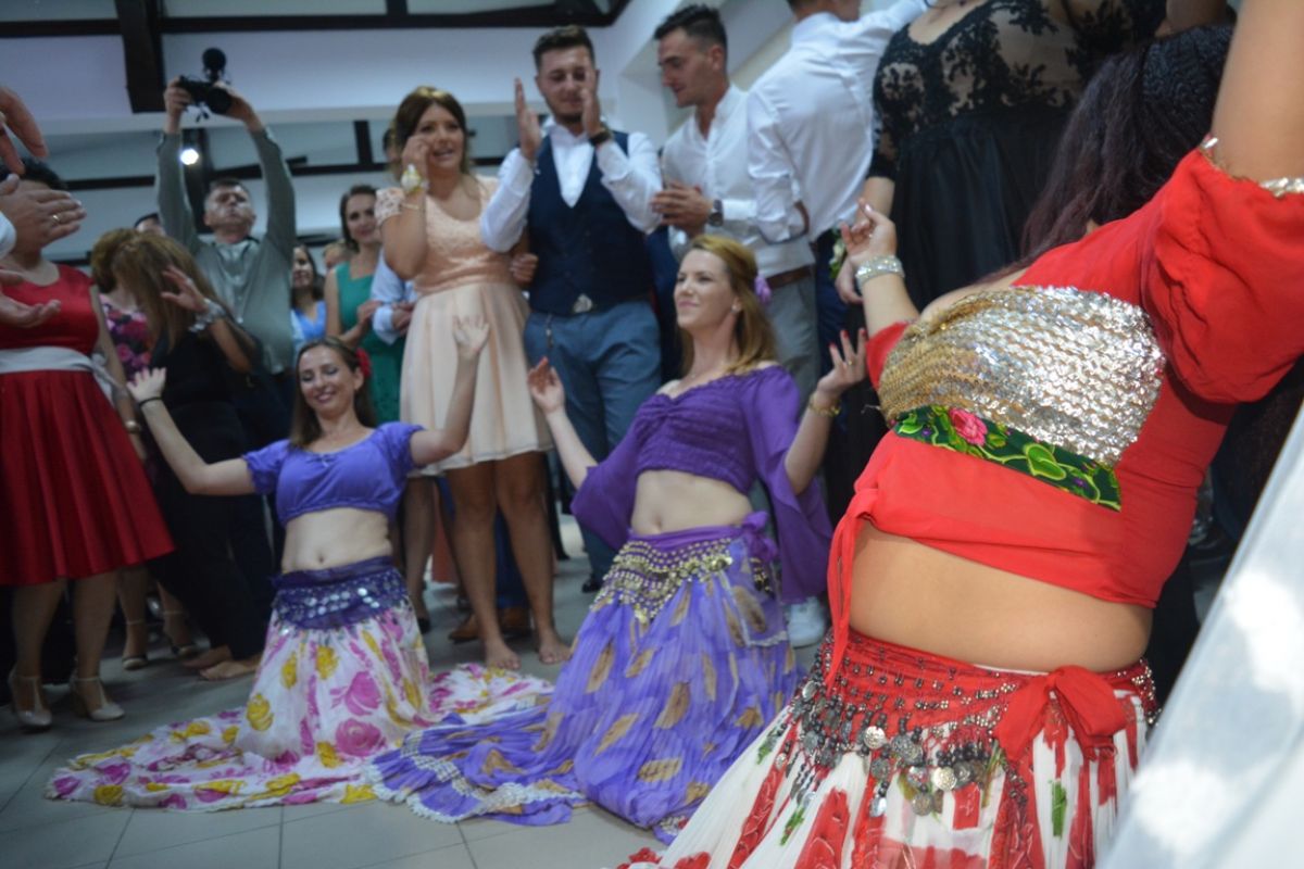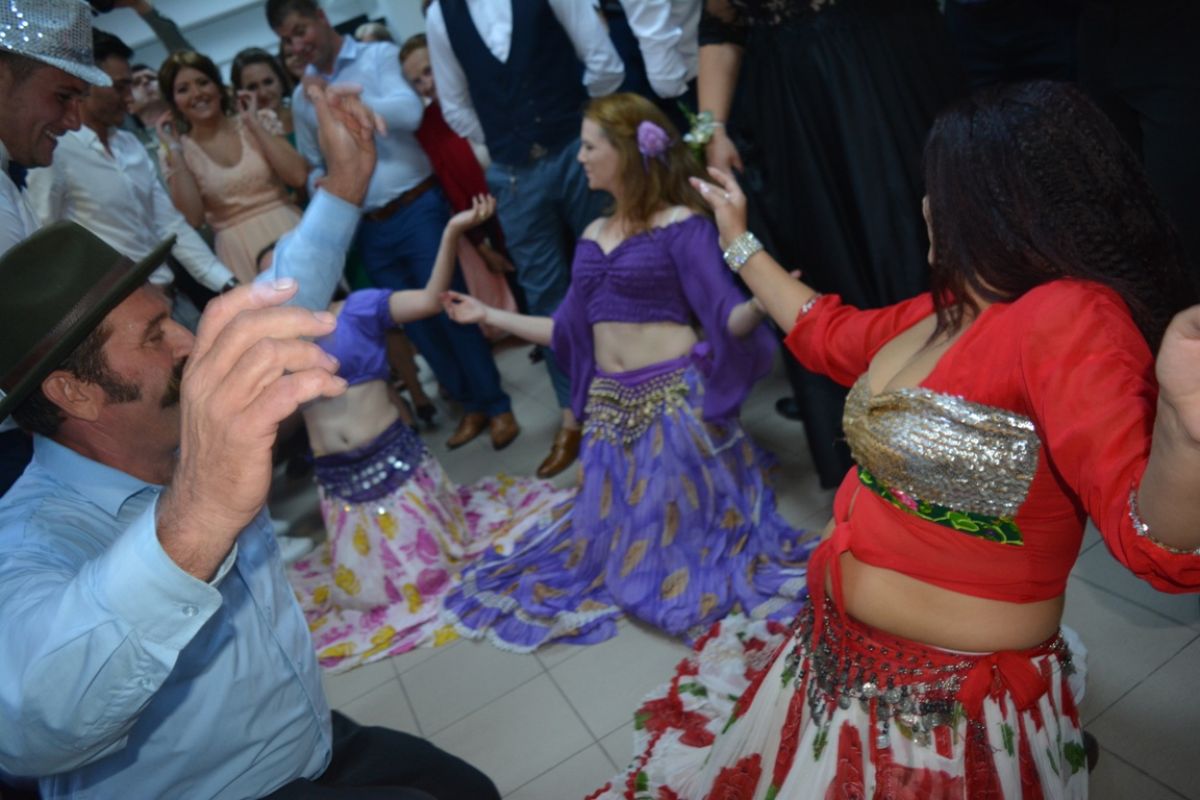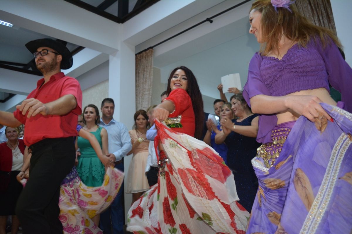 Trei tinere, toate îmbrăcate în straie specifice etniei conlocuitoare, însoțite de un tânăr într-o costumație așijderea, au încins pe loc petrecerea.