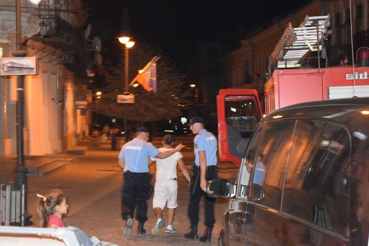În drum spre duba Jandarmeriei, unul dintre bătăuși s-a împiedicat și în cădere a tras și un jandarm după el, care a căzut la rându-i. Scandalagiul avea deja cămașa ruptă după ce s-a bătut cu amicul lui.