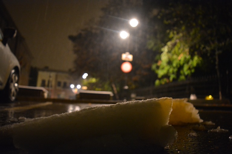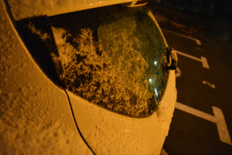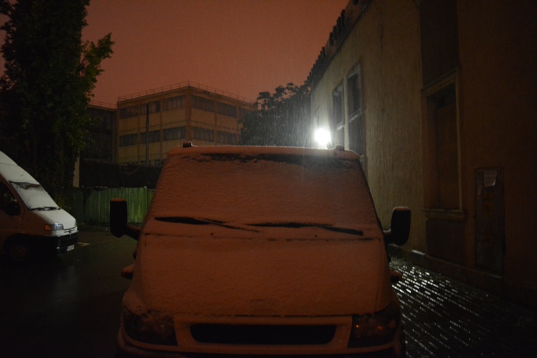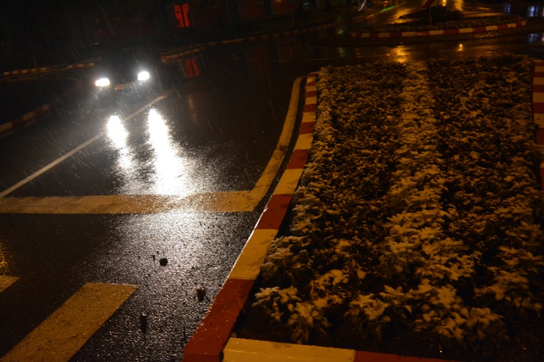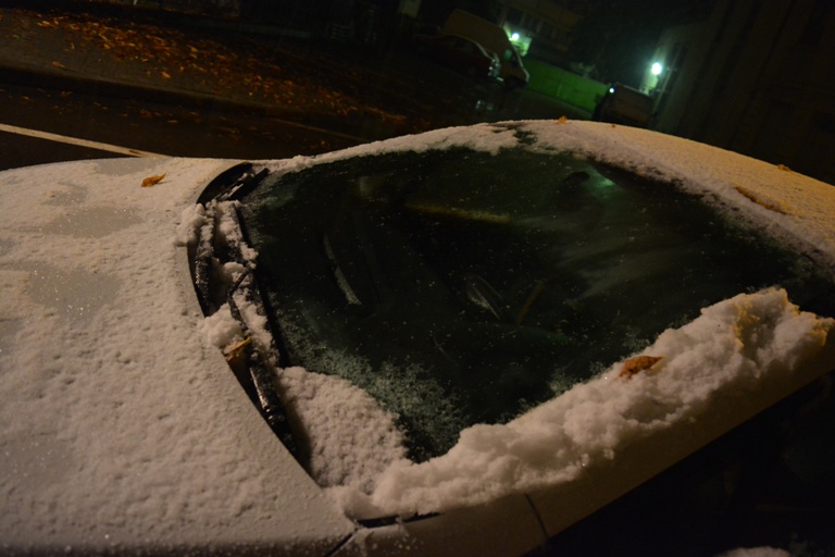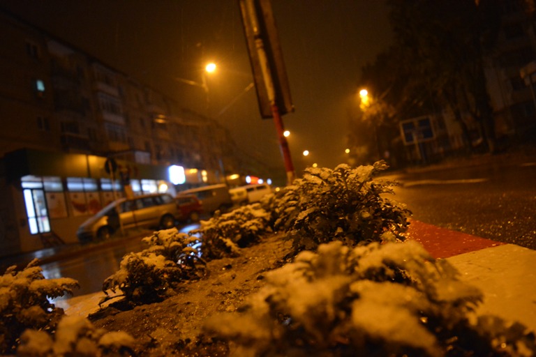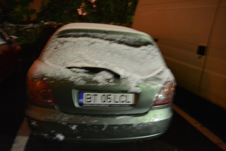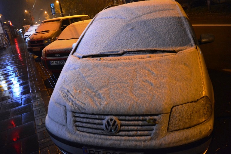 Lapoviţa s-a transformat treptat în ninsoare şi o mulţime de conducători auto care au trebuit să plece la drum au avut de îndepărtat zăpadă de pe maşină. Nu doar pe automobile şi-a făcut însă prezenţa zăpadă. Spaţiile verzi dintre blocuri şi din stradă au devenit în bună parte albe.