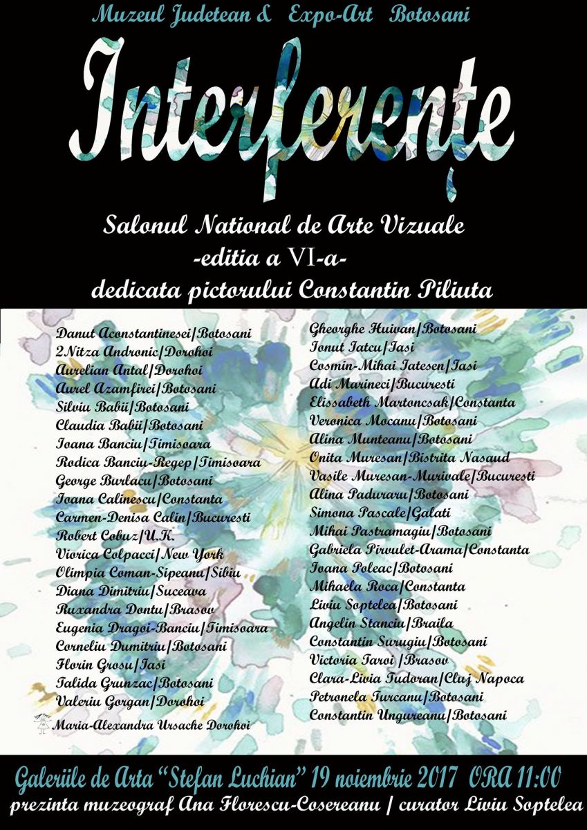 Muzeul Judeţean Botoşani prezintă în perioada 19 noiembrie – 7 decembrie 2017, în spaţiul Galeriilor de Artă „Ştefan Luchian” Botoşani, cea de-a VI-a ediție a Salonului Naţional de Arte Vizuale ,,Interferenţe".