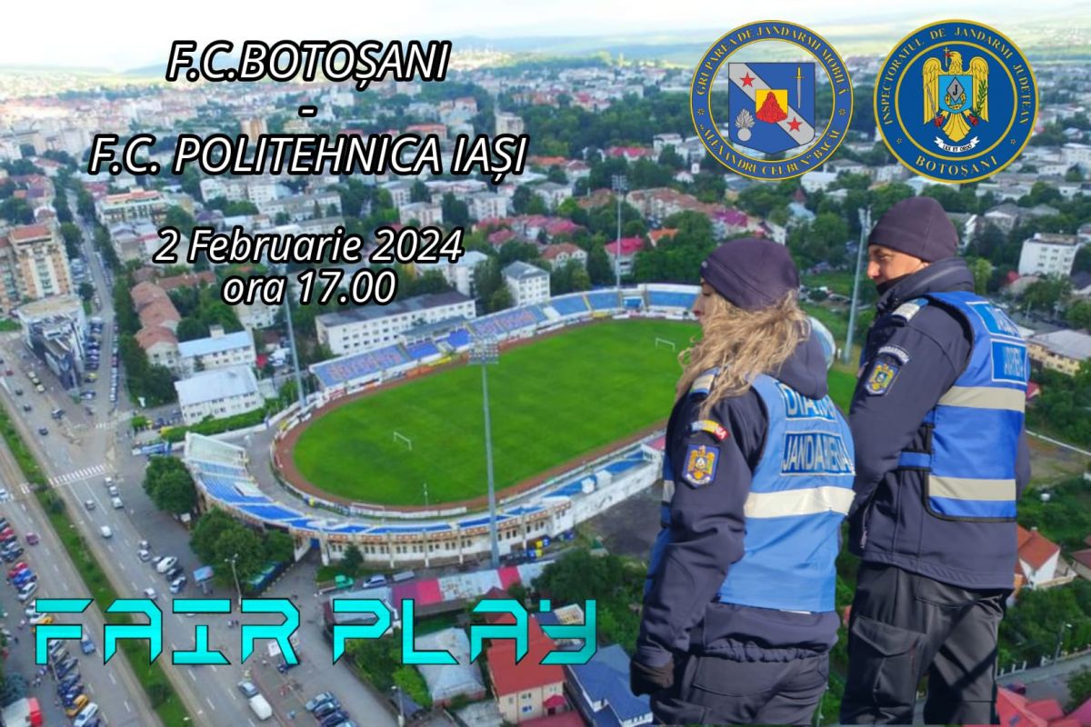 Gruparea de Jandarmi Mobilă „Alexandru cel Bun" Bacău va asigura integrarea tuturor măsurilor de ordine și siguranță publică în municipiul Botoșani, la meciul de fotbal dintre echipele FC Botoșani și FC Politehnica Iași, partidă ce se va disputa astăzi, 2 februarie 2024, începând cu ora 17.00, pe stadionul municipal din localitate.