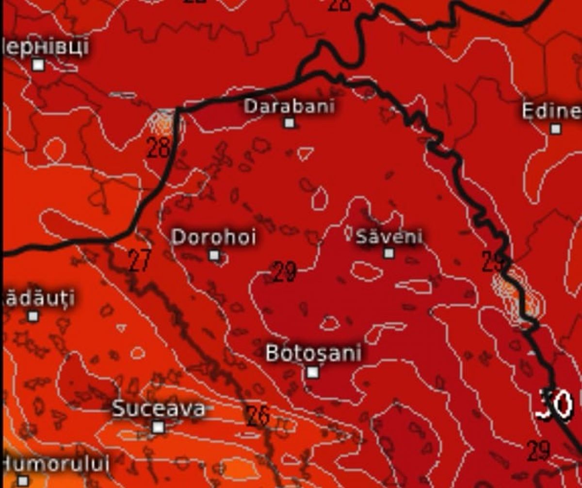 În schimb, pe parcursul zilei de joi, 12 mai, vremea va fi deosebit de caldă pentru perioada din calendar. Astfel, maximele vor fi cuprinse între 18°C, în zonele montane, și 29°C, posibil izolat, chiar 30°C în Lunca Prutului. Cerul va fi variabil.