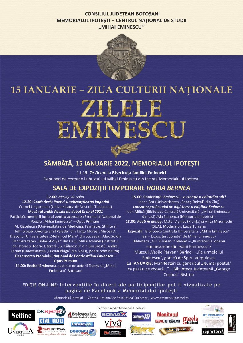 Manifestările vor începe la ora 11.15 cu Te Deum la Bisericuța Familiei Eminovici, urmat de depuneri de flori la bustul lui Mihai Eminescu de la Memorialul Ipotești.