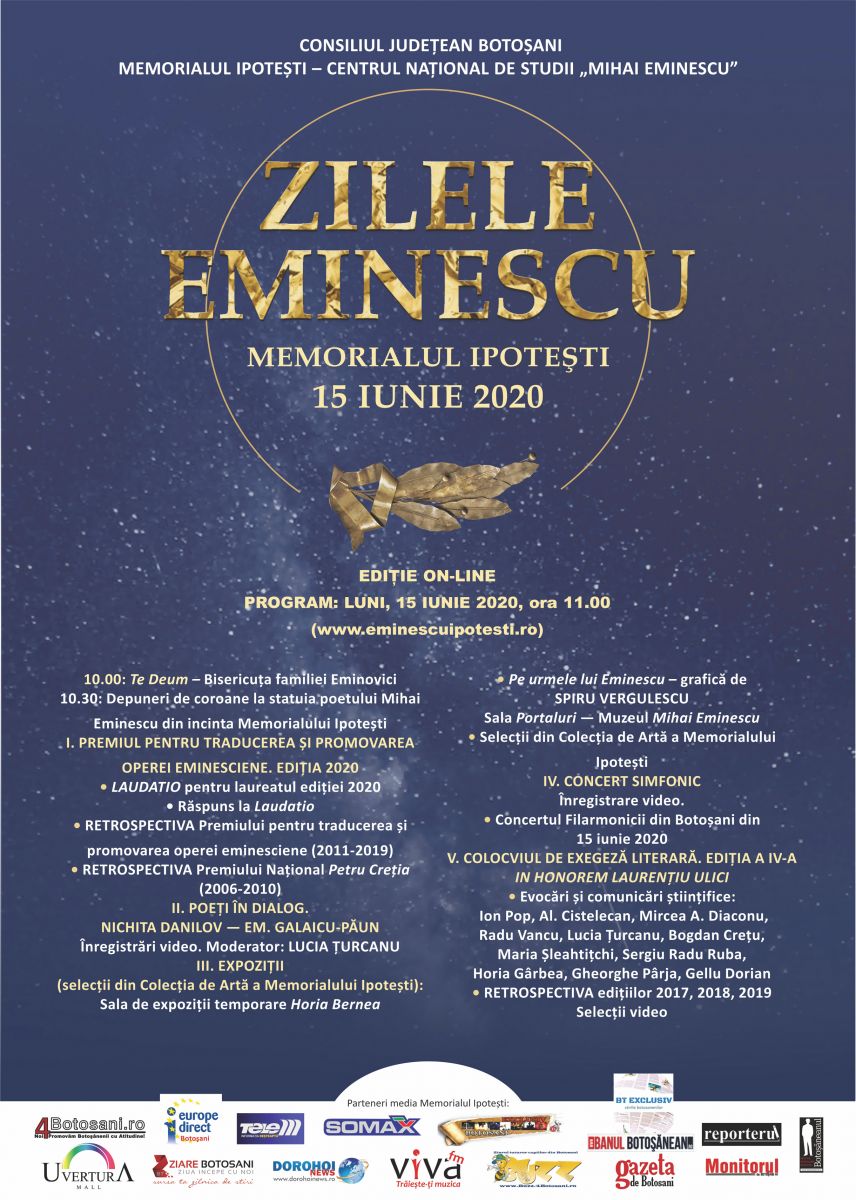 Memorialul Ipotești – Centrul Național de Studii „Mihai Eminescu” organizează Zilele Eminescu, ediția din iunie. Dată fiind starea de alertă în care ne aflăm și necesitatea luării măsurilor pentru prevenirea contaminării cu noul coronavirus SARS-CoV-2, activitățile se vor desfăşura on-line.