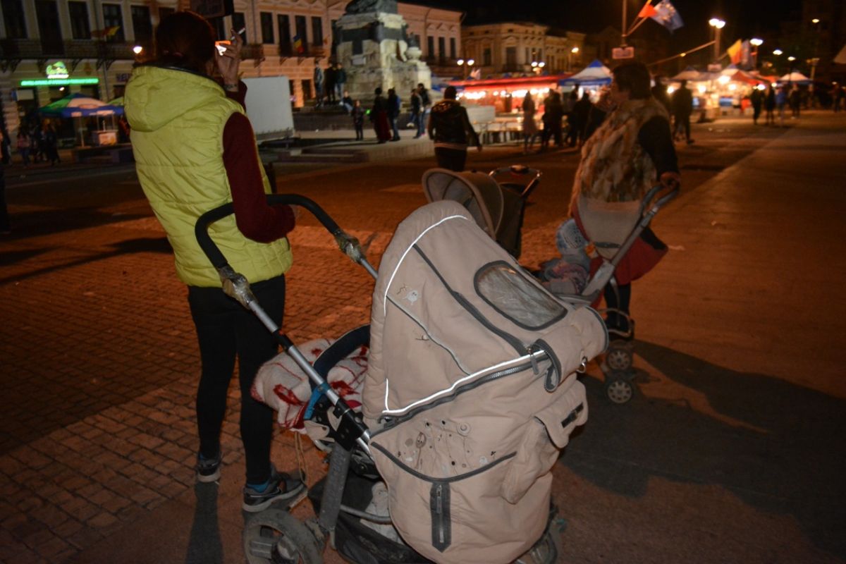 Oricum, în Piața 1 Decembrie 1918 nu se mai aflau decât vreo 300 de oameni, cu tot cu vânzătorii de la terase iar ”în culise” nici un ales de la municipiu. Printre ei, trei femei cu copii în landouri, care au considerat probabil că este foarte nimerită pentru bebeluși o plimbare învăluită în fum de grătar. O altă mamă stătea în fața unui magazin de lângă Biserica Uspenia alături de fiica sa, dezbrăcată de la jumătate în jos. Iar în spatele locașului de cult, urina pe gard un bărbat în toată regula. Jandarmi și polițiști erau în Centrul Vechi, dar păzeau ”megashow-ul” karaoke.