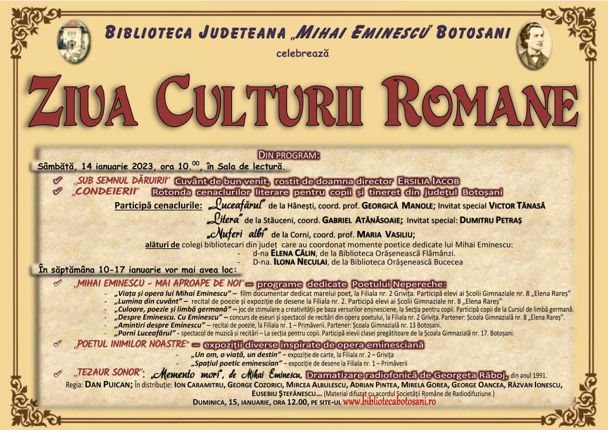 Sub auspiciile Zilei Culturii Naționale, Biblioteca Județeană ”Mihai Eminescu” din Botoșani organizează și în acest an Rotonda cenaclurilor literare pentru copii și tineret din județul Botoșani.