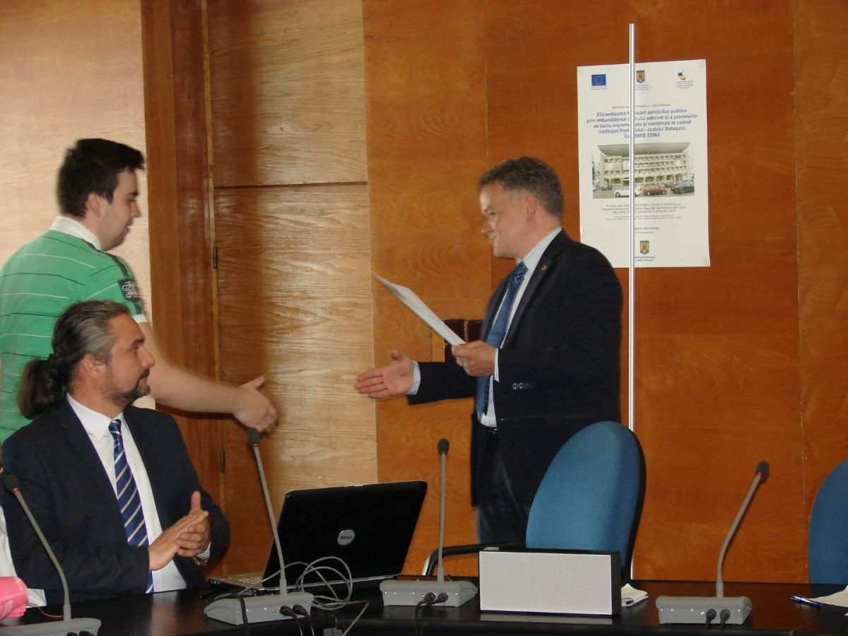 Cei prezenţi au putut vedea imaginile din competiţia mondială a roboţilor sumo de anul trecut, când botoşănenii i-au învins pe mexicani. Tinerii au ieşit pe locul I la nivel naţional şi în acest an, pregătindu-se, aşadar, sub coordonarea profesorului Grigore Luisian, de competiţia mondială ce stă să vină. Prefectul Dan Nechifor a premiat toţi elevii şi profesorii prezenţi în Palatul administrativ pentru a sărbători Ziua Europei, fiind vizibil impresionat de toate prezentările tinerilor.