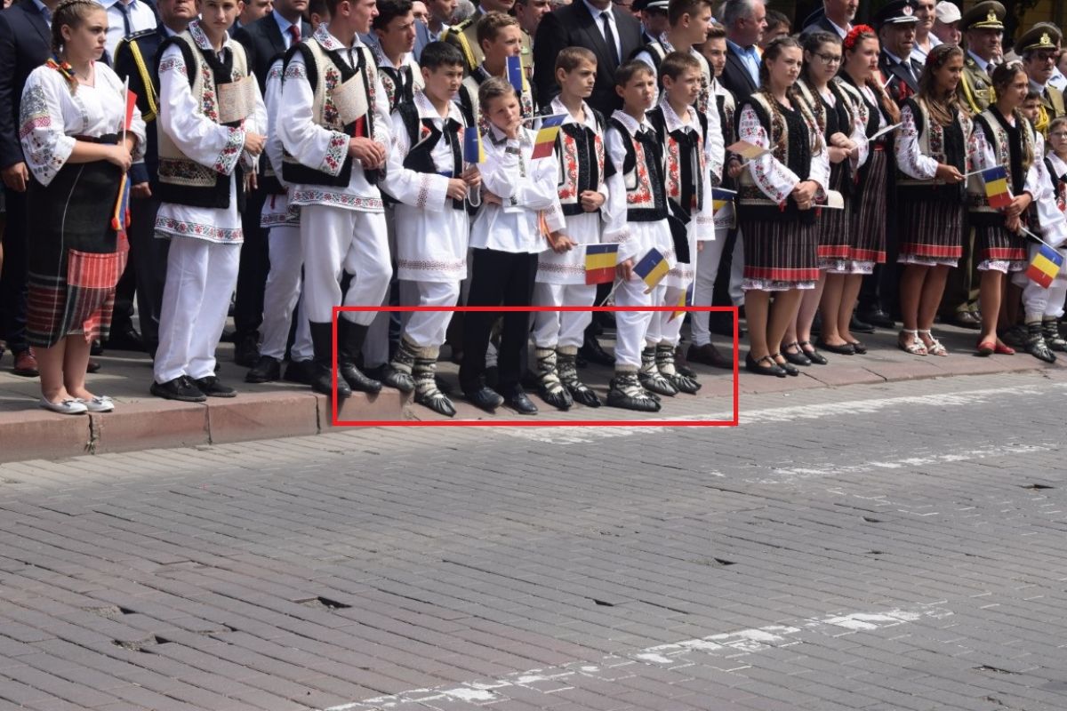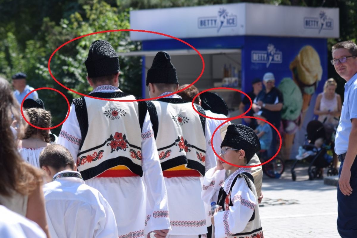 Dacă doamnele însoțitoare aveau rochii vaporoase și sandale, la temperaturi de peste 30 de grade, unii dintre copii au fost aduși cu căciuli din miel pe cap și cu șosete din lână și opinci în picioare și au fost ținuți astfel timp de o oră cât a durat ceremonia. Portul popular plecat din rândul oamenilor de la sate, chiar și la nivelul de educație existent acolo, nu impune articole vestimentare de iarnă, pe timpul verii.