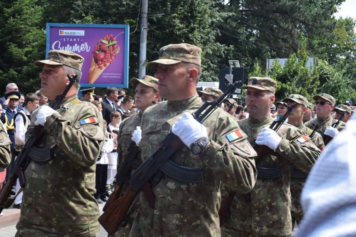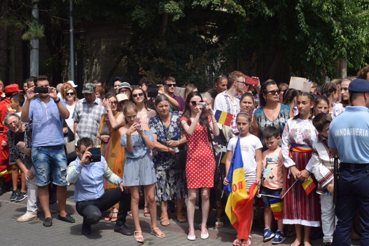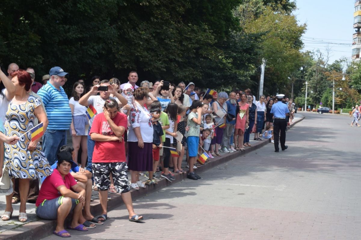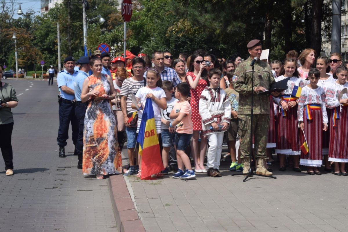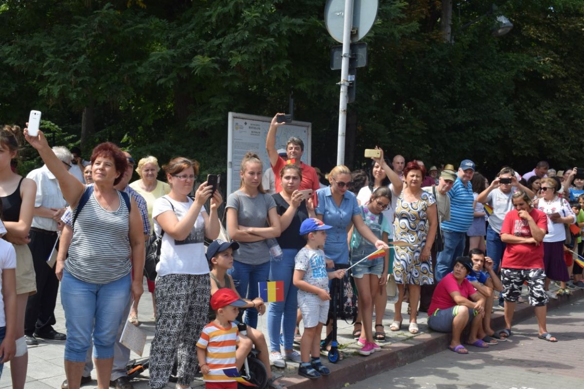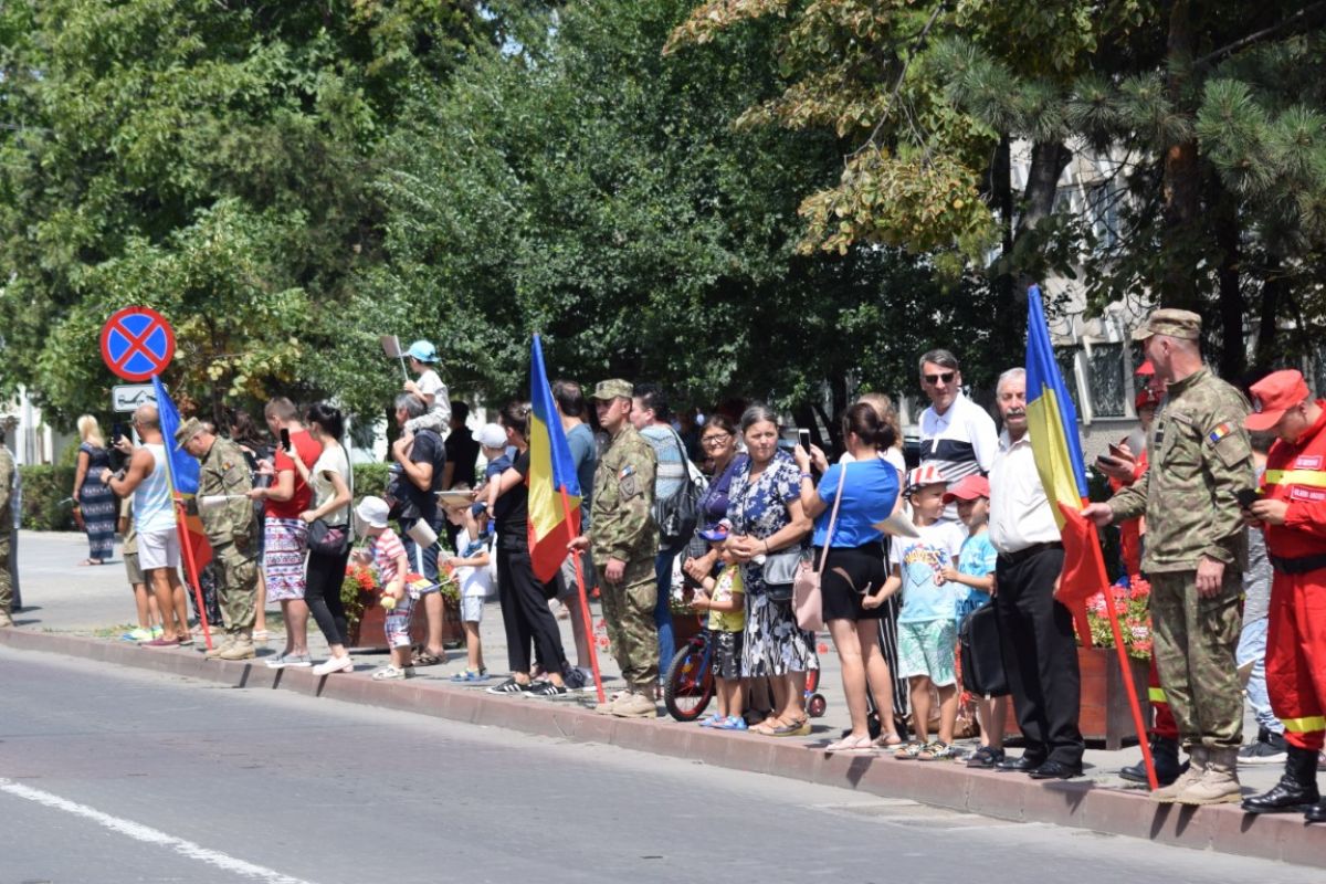 Oamenii prezenți au primit stegulețe tricolore pe care le-au fluturat când au defilat militarii. Niciun politician nu a luat cuvântul.