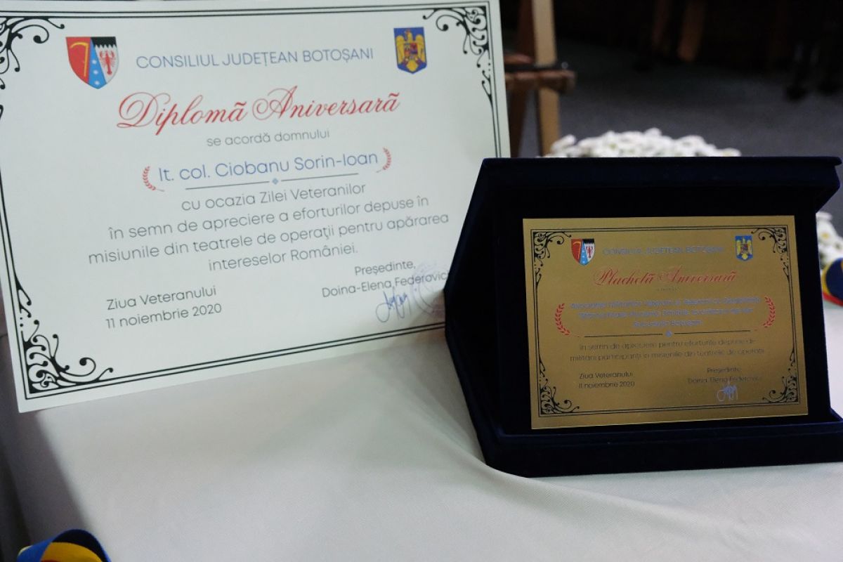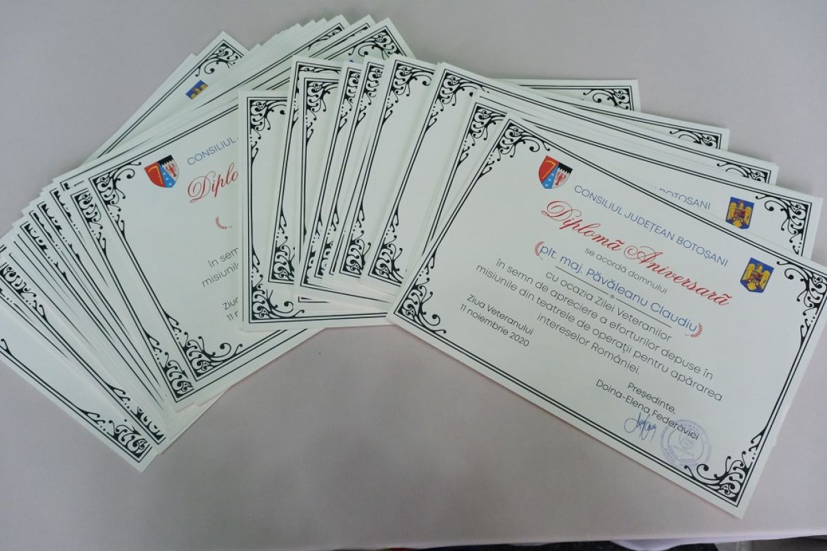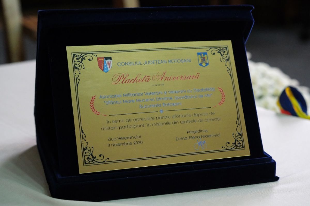 Cu prilejul sărbătoririi, pe data de 11 noiembrie, a Zilei Veteranilor, Consiliul Județean Botoșani, în colaborare cu Primăria Municipiului Botoșani, au organizat, în Sala Polivalentă a Muzeului Județean Botoșani, un eveniment menit să onoreze militarii botoșăneni ce au luat parte de-a lungul timpului la misiunile de apărare și restaurare a păcii din teatrele de operații internaționale.